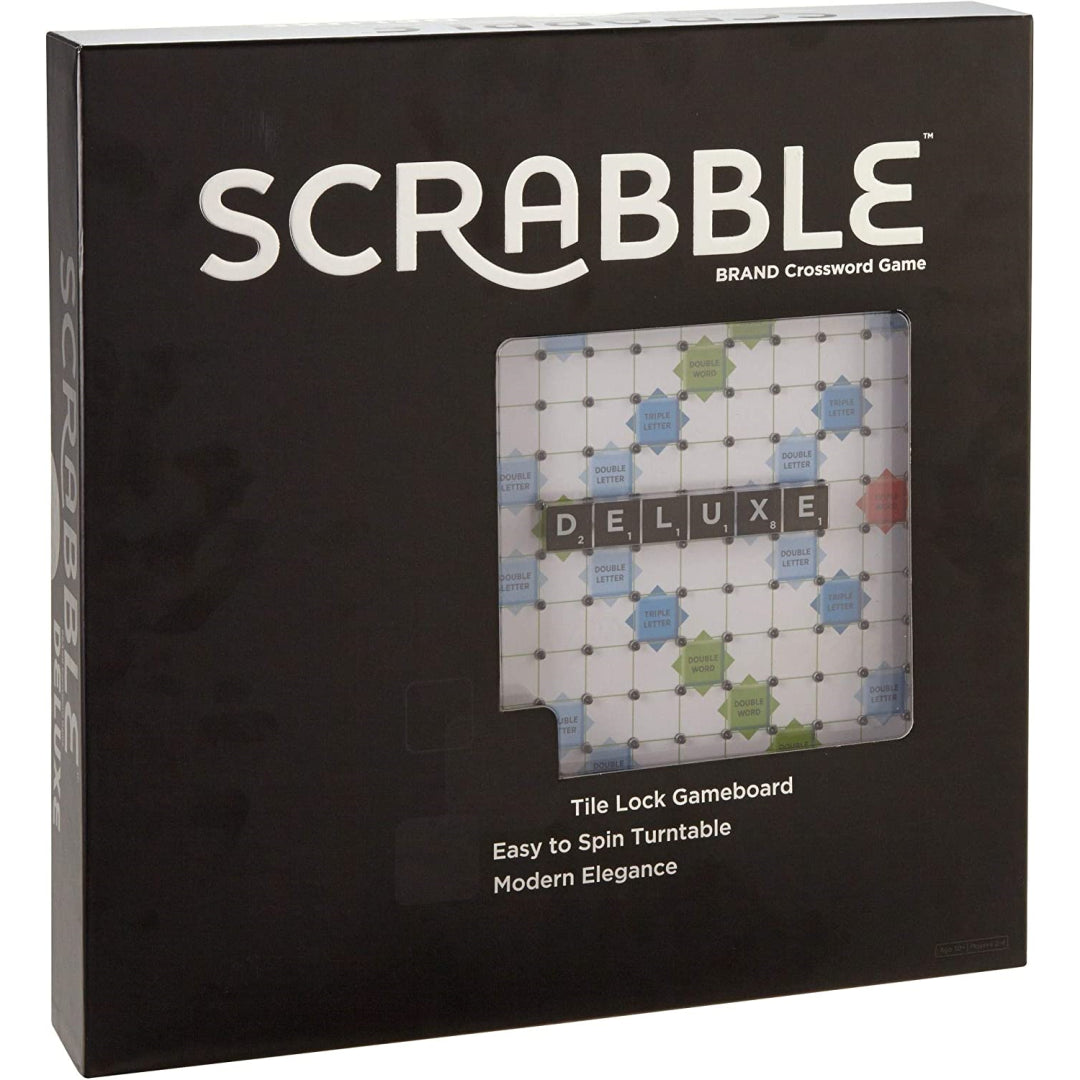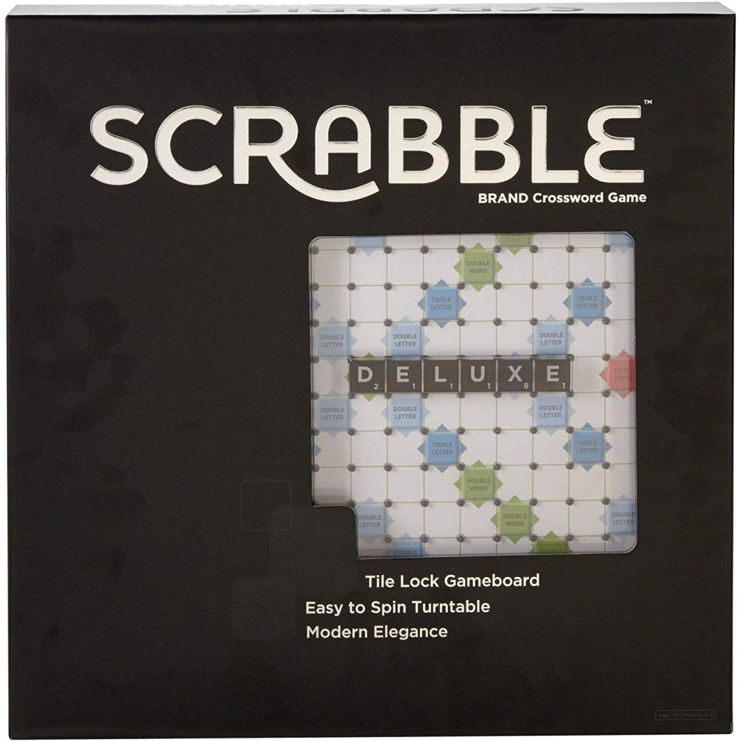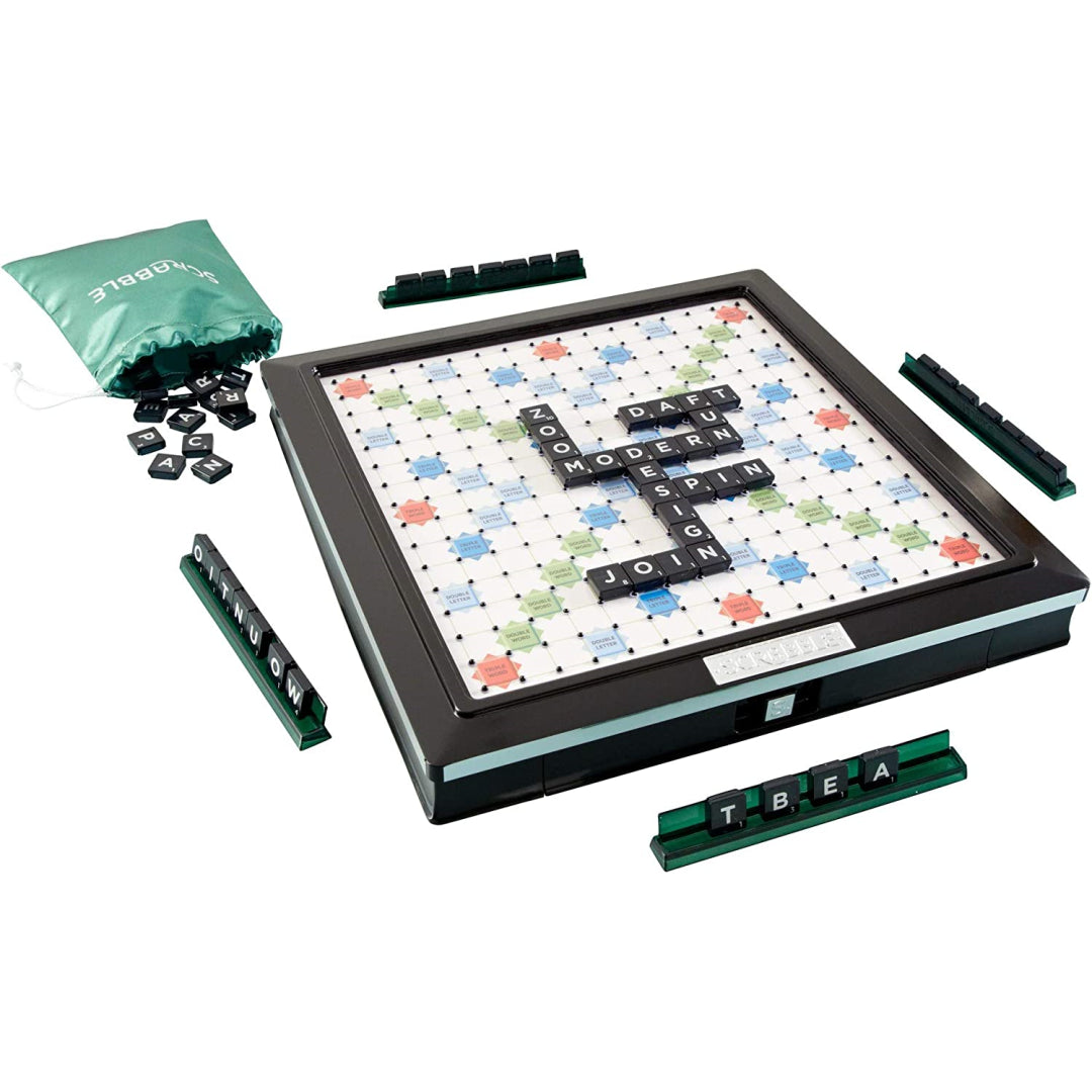 When you play this deluxe version of one of the most popular word games in the world, every word you say must be carefully considered. Scrabble Deluxe is the ideal combination of sleek looks and improved functionality, featuring an elegant board in contemporary colours and chic black styling along with a built-in turntable and storage drawer. This board also features a chic black design. This enhanced edition of Scrabble, just like the original, allows for two to four players to compete against one another for the highest score possible by forming interlocking words on the Scrabble board in the style of a crossword puzzle. The letters that make up the score are displayed on the tiles. br> Raise your score by placing tiles in locations and combining them in ways that make the most of the letter values and the premium squares. You can do this by using the tiles in combinations that maximise the use of both types of squares. Greater points can be earned, for instance, by achieving a triple-letter score or a double-word score on the board. Includes a game board, a rules guide, 100 letter tiles stored in a sleek green pouch, and four tile racks to store the tiles. When you play this deluxe edition of the most famous word game in the world, every word you say must be considered. Featuring an elegant board with contemporary colours and a stylish black design, in addition to an integrated turntable and storage drawer, this product offers a combination of improved functionality and a streamlined appearance. This version, like the original, allows for two to four players, and the goal is to earn the highest score possible by connecting words on the Scrabble board in the style of a crossword puzzle. Players compete against one another to see who can do this the fastest.
