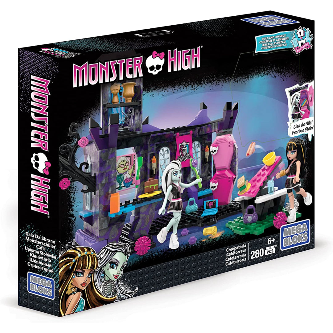 Cleo de Nile and Frankie Stein are headed to the Creepateria by Mega Bloks Monster High for lunch after working up an appetite during terror squad practise. The unfortunate thing is that the special of spaghetti and eyeballs makes them want to return their orders back. Construct the Creepateria with all of its features, including a trophy tower, a service counter stocked with horrifying fare, and an outside picnic table where the ghouls may sit and gnaw on their food. Then brace yourself for a frightening experience with your meal as you use the picnic table as a rocket to send it flying in all directions.