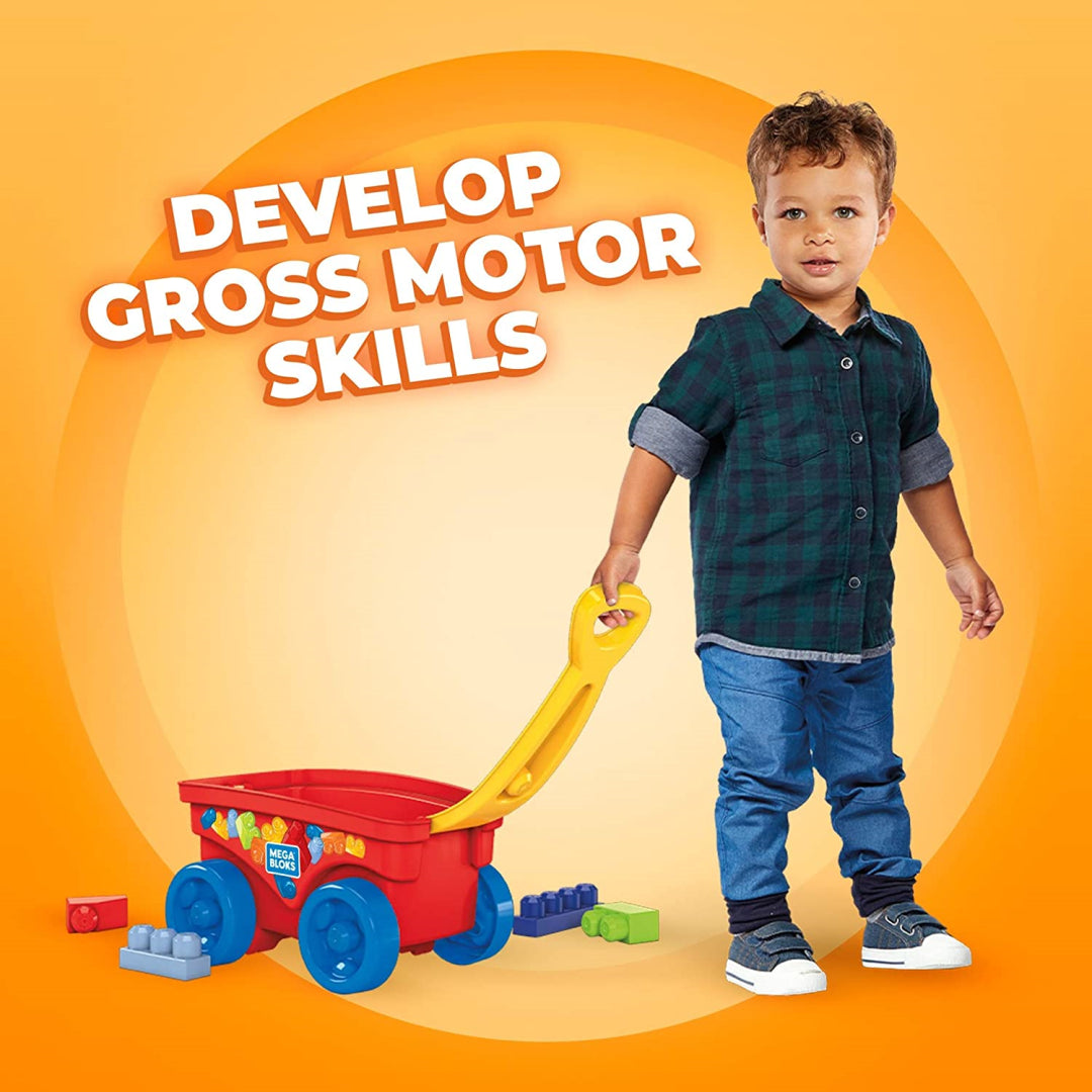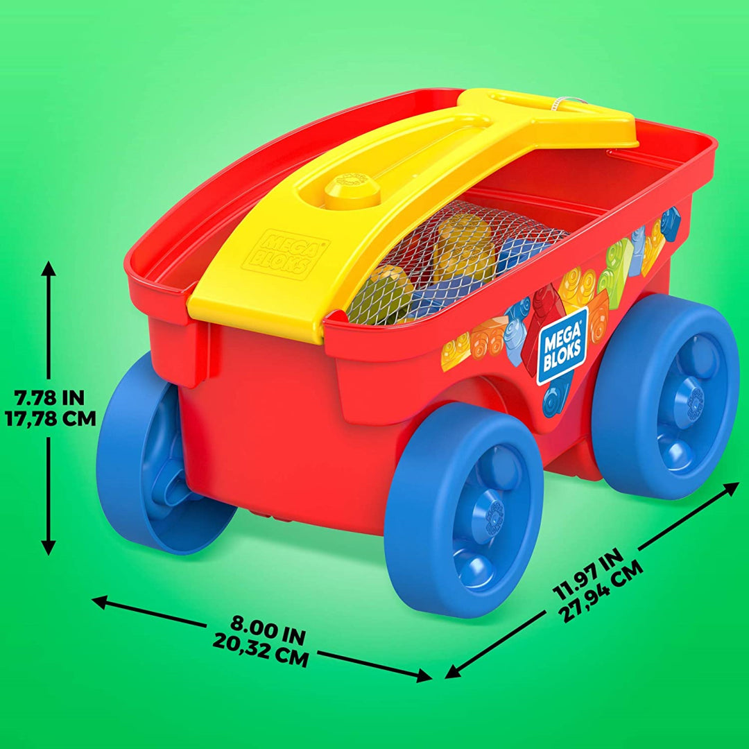 The construction kit consists of a brightly coloured draw waggon with a fold-out, easy-to-grip handle and prongs to build onto 15 large building blocks that are meant to be long-lasting and come in traditional colours. These blocks may be used to construct anything that your child can envision.