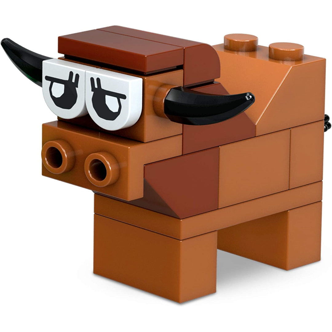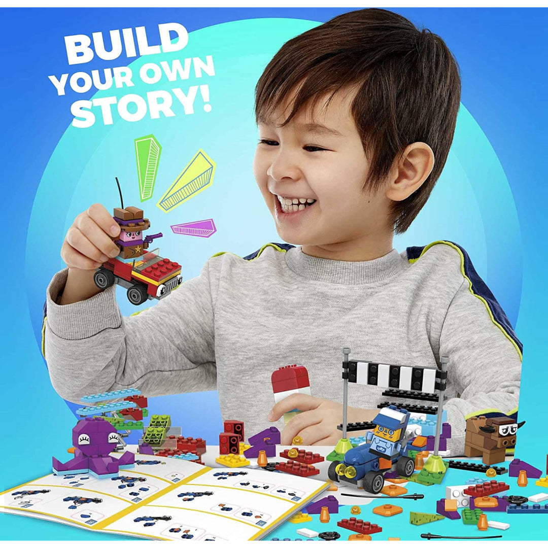 A 325-piece construction kit that may be assembled into comical humans, ludicrous animals, and other amusing things Construct a dinosaur, a bull, an octopus, an ice pop, two automobiles, a finish line, robots, cowgirls, and mechanics, or come up with your own hilarious inventions.