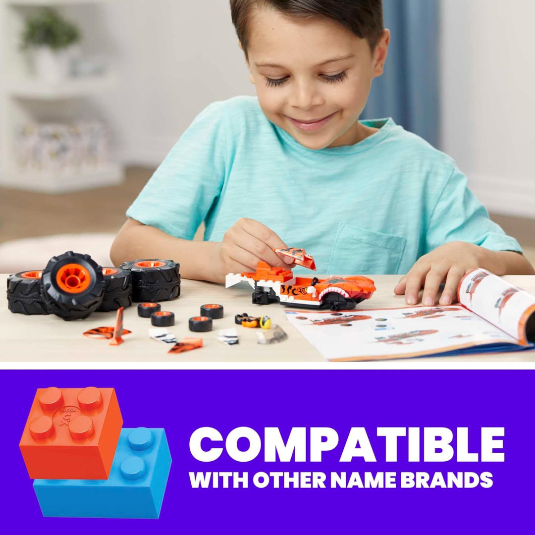 Prepare yourself for the craziest smash-and-crash action as you play with this Mega Construx Hot Wheels construction toy! With its distinctive characteristics (such the enormous wheels and tiger paint), this building kit for the Hot Wheels Tiger Shark Monster Truck is eerily similar to the real Monster Truck model.Realistic construction play may be achieved by placing the action figure in the driver's seat. Build your own enormous Hot Wheels Monster Truck assorent by expanding your collection with additional construction kits (separately offered)! Perfect for children five years old and above.