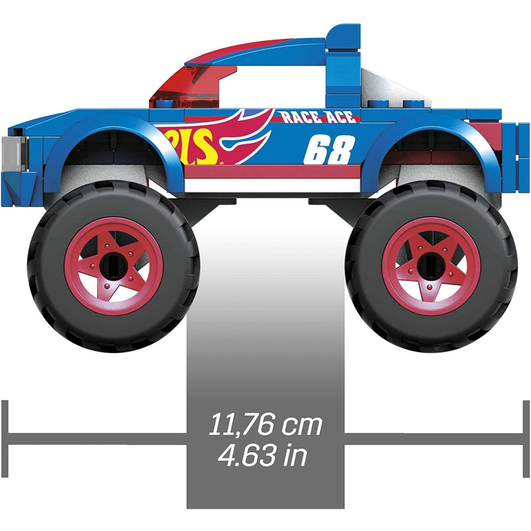 With the MEGA Hot Wheels Race Ace building set, you can get ready for monster action with a vehicle that is based on the original model of a monster truck. This vehicle has authentic Hot Wheels details like giant wheels, a red and blue paint job, and a rear bed. It also features details like the Hot Wheels logo. Place the micro action figure that is included in the set into the driver's seat, and use it in conjunction with other MEGA Hot Wheels building sets to design and build your very own customised monster trucks. MEGA Hot Wheels Race Ace Monster Truck construction set with 69 individual pieces.