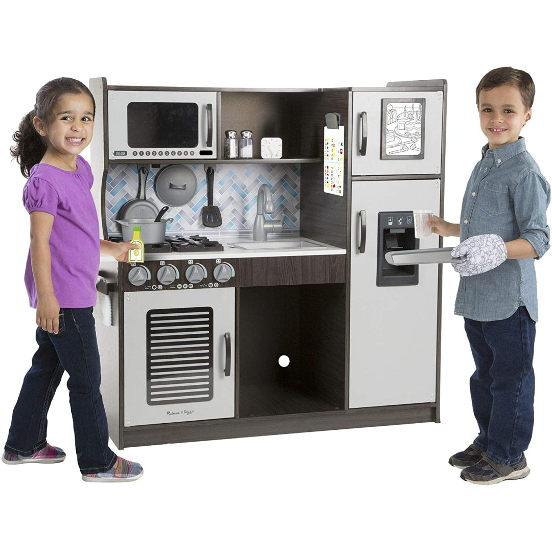 Kitchen set by Melissa and Doug that contains an oven, a stove with a functional "ice" dispenser, a sink, a refrigerator with a "ice" dispenser, a freezer, and plenty of storage space for simple cleaning.