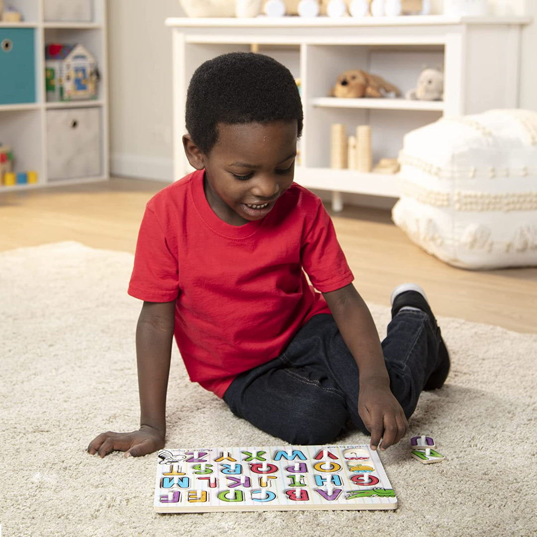 The alphabet, numbers, and colours may be learned in a fun manner with the help of this set of three peg puzzles.