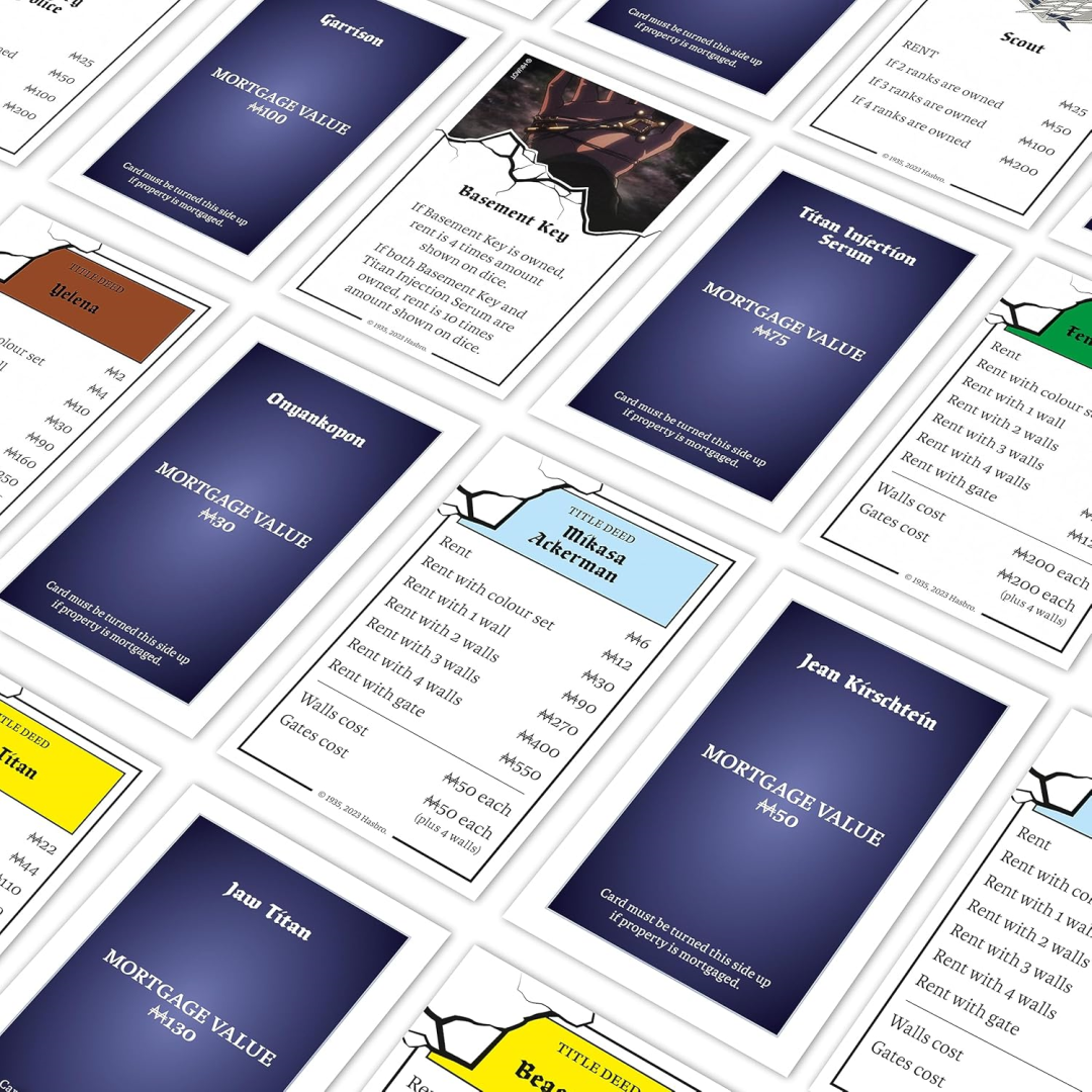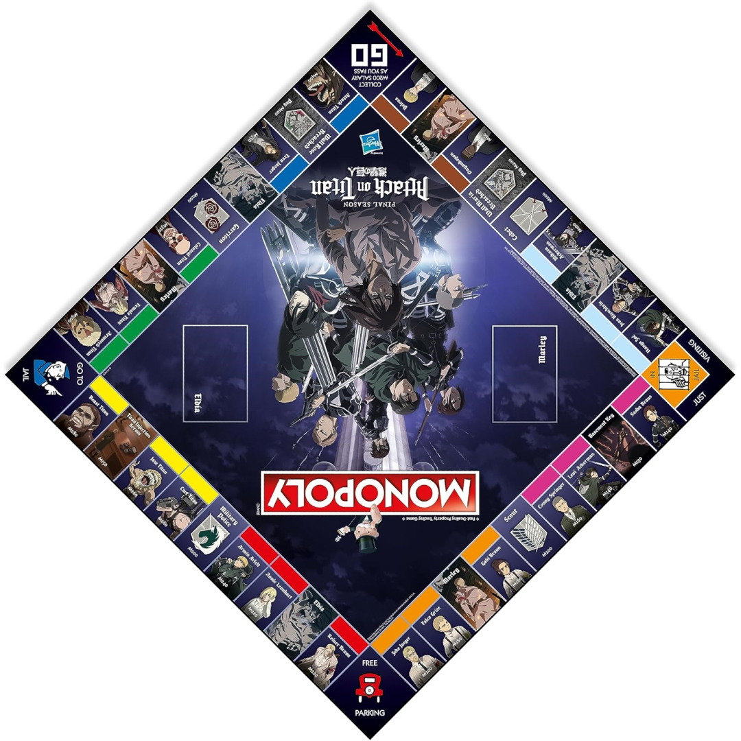 This customised version of Monopoly is perfect for Attack on Titan fans. It is made for two to six players and is a great present for those who are eight years of age and older. Six metal tokens, including the waggon, key, mobility gear, flare gun, sword, and cannon, are included in the game. Characters from the Attack on Titan world may be found on the exclusive game board. Purchase colour sets and construct your empire with your personalised funds. Custom Marley and Eldia cards might make or break your chances of success, so be cautious. In this thrilling version, outsmart your rivals and trade your way to success!