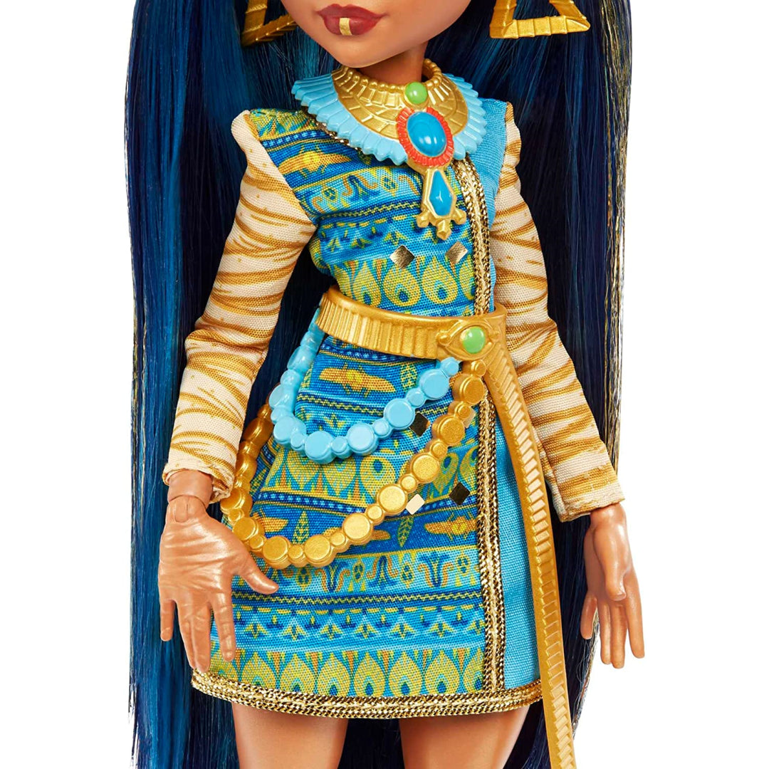 Give your little one a ghoulishly good time with this Monster High Cleo De Nile doll and her spooky pet companion. Perfect for creative play without breaking the bank, this posable fashion doll comes dressed to impress in a stunning blue and gold dress with mummy-wrap styled sleeves and a chain belt that adds just the right amount of haunted chic.