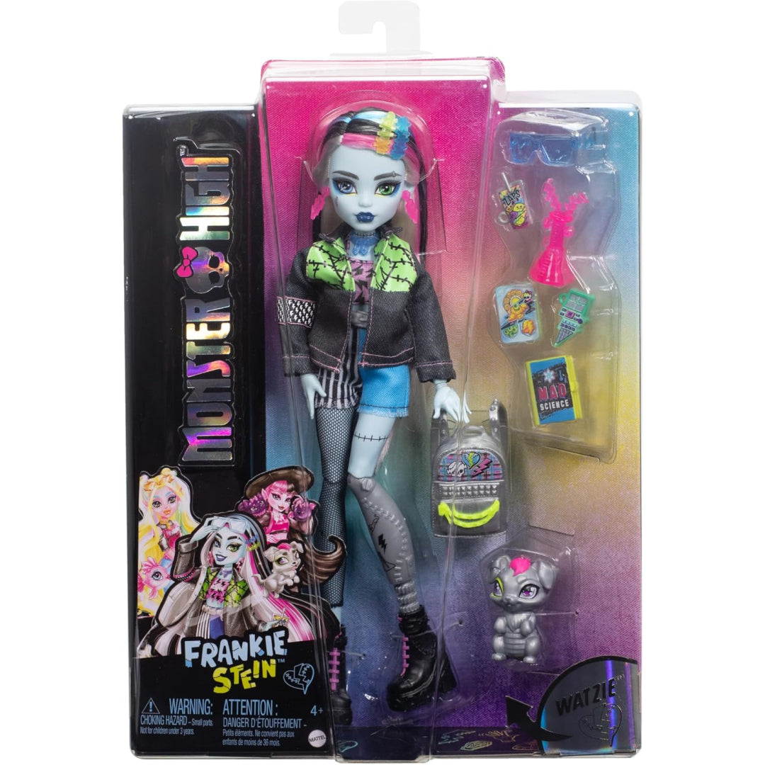 Your budget-conscious shopping just got better - this Monster High doll includes brilliant accessories like lightning bolt earrings, a silver backpack, science notebook, chemistry beaker, calculator, sunglasses and even a packed lunch! Plus, Frankie's metallic silver pet puppy Watzie is included for extra play value.