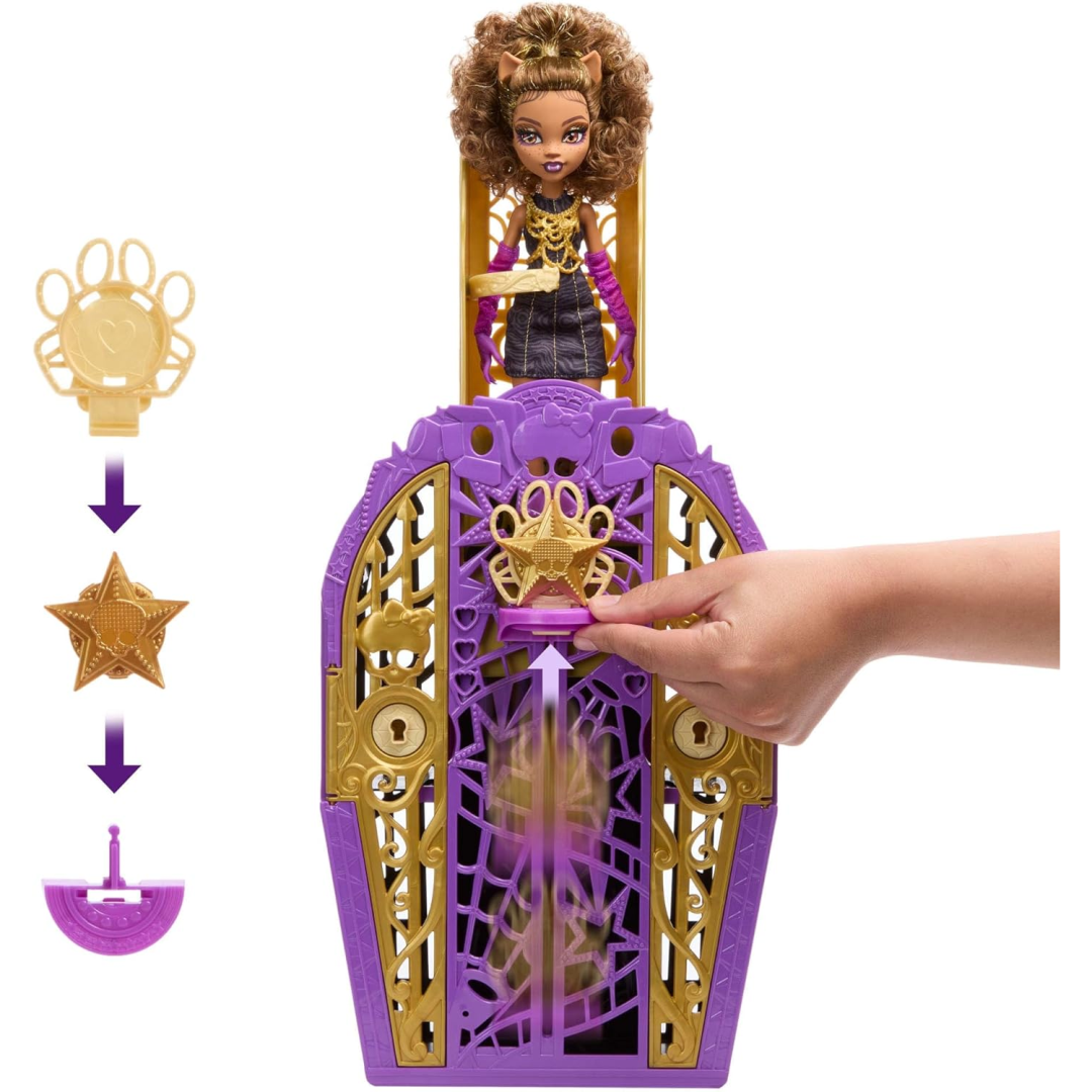 Here's where the fun really begins: your little detective uses the magnifying glass key to decode hidden symbols on the treasure map, then unlocks the closet doors to hunt for matching charms amongst all the gorgeous red carpet accessories. Piece together the 3 charms to create a mystery talisman, and watch as Clawdeen Wolf appears in her full Hauntlywood glory. The best bit? You can repeat this exciting reveal process over and over again, making it brilliant for extended play that actually lasts.