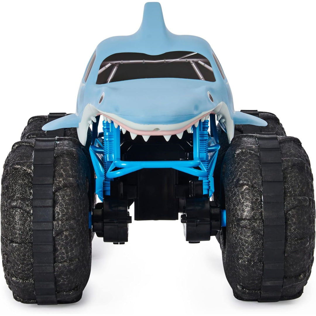 Experience the thrill of off-road action with the All-Terrain Remote Control Monster Truck, available in a 1:15 scale. Take the reins of Monster Jam's iconic Megalodon with the Megalodon STORM RC! Engineered with a water-resistant body and specialized lightweight tires, this robust monster truck can traverse water and seamlessly transition to land without missing a beat. Conquer various terrains including snow, mud, rocks, and grass with ease. Navigate left and right, move forward and reverse effortlessly using the user-friendly remote control. With its authentic design and BKT tires, the Megalodon STORM RC provides an immersive driving experience akin to the real thing. Transform any environment into a thrilling Monster Jam arena with the Megalodon STORM RC!