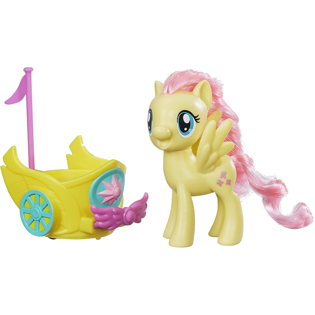 Fluttershy is excited for the Grand Galloping Gala because she will get to attend in a charming chariot! Pretend that you are going to the celebration with her in a luxurious mode of transportation. This delightful My Little Pony Fluttershy Royal Spin-Along Chariot set features a Fluttershy pony figure that measures three inches in height along with a chariot vehicle. The figure of the pony rides atop the chariot as it moves forward while turning in circular motions. Put the Fluttershy pony figurine on the yellow chariot, pull it back, and then let go so you can watch her twirl and race away! Hasbro owns the intellectual property rights to My Little Pony and all of the characters that are associated with it.