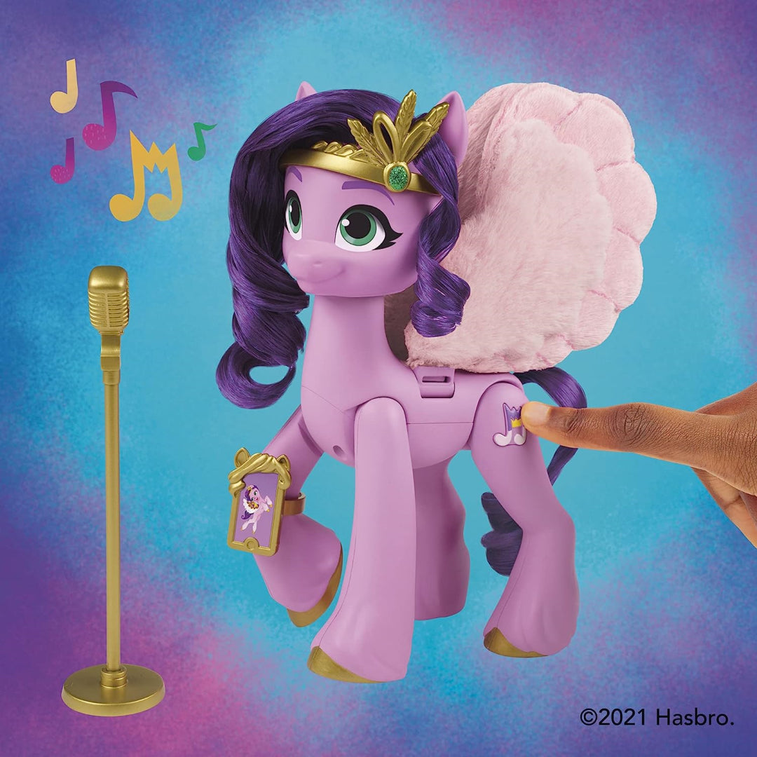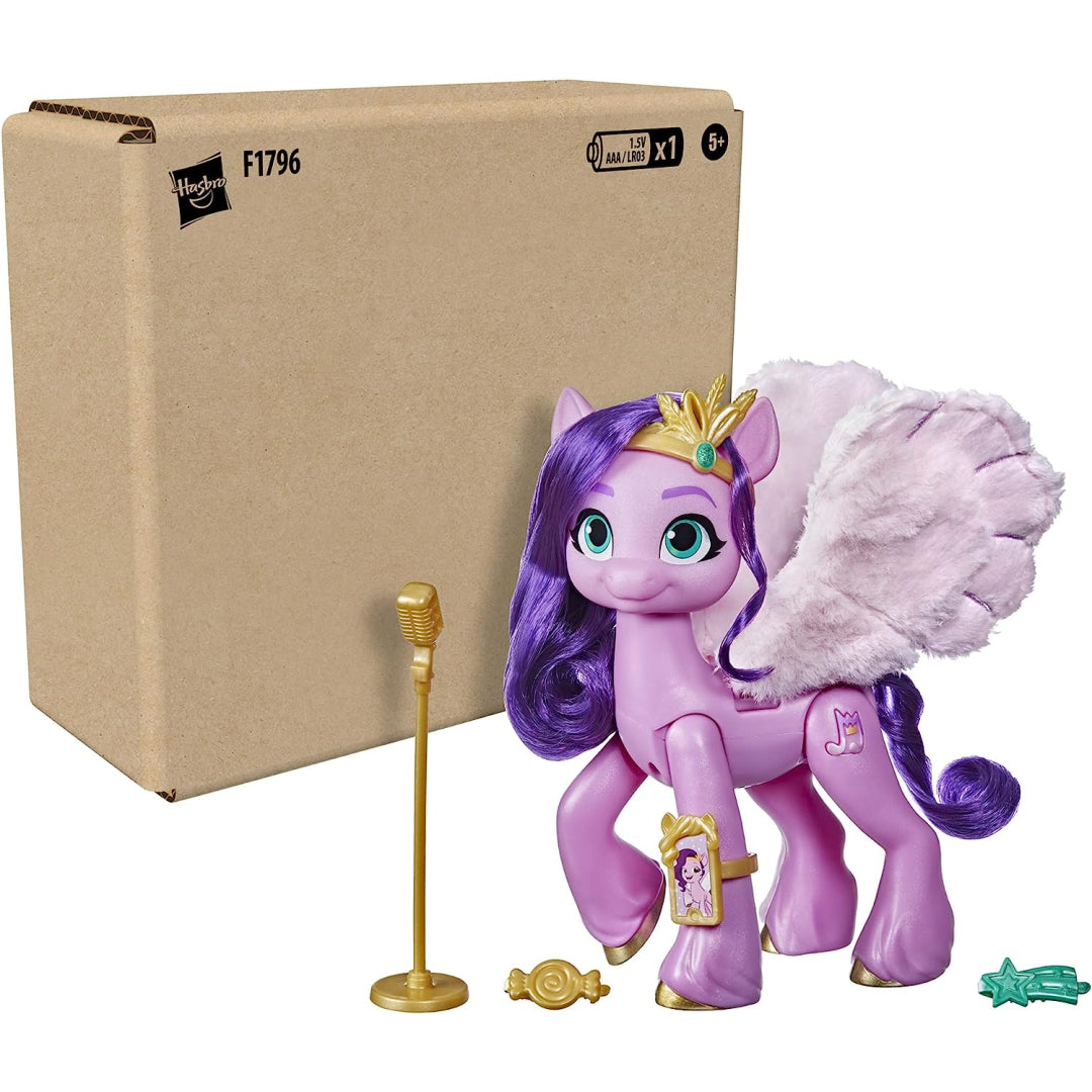 Bring home the magic of My Little Pony with this interactive Singing Star Princess Petals figure! Standing 6 inches tall, this charming pink Pegasus from Zephyr Heights is ready to dazzle with her special talents. Press her musical note Cutie Mark to hear her perform, and squeeze her legs together to watch her fluffy wings flutter with delight.