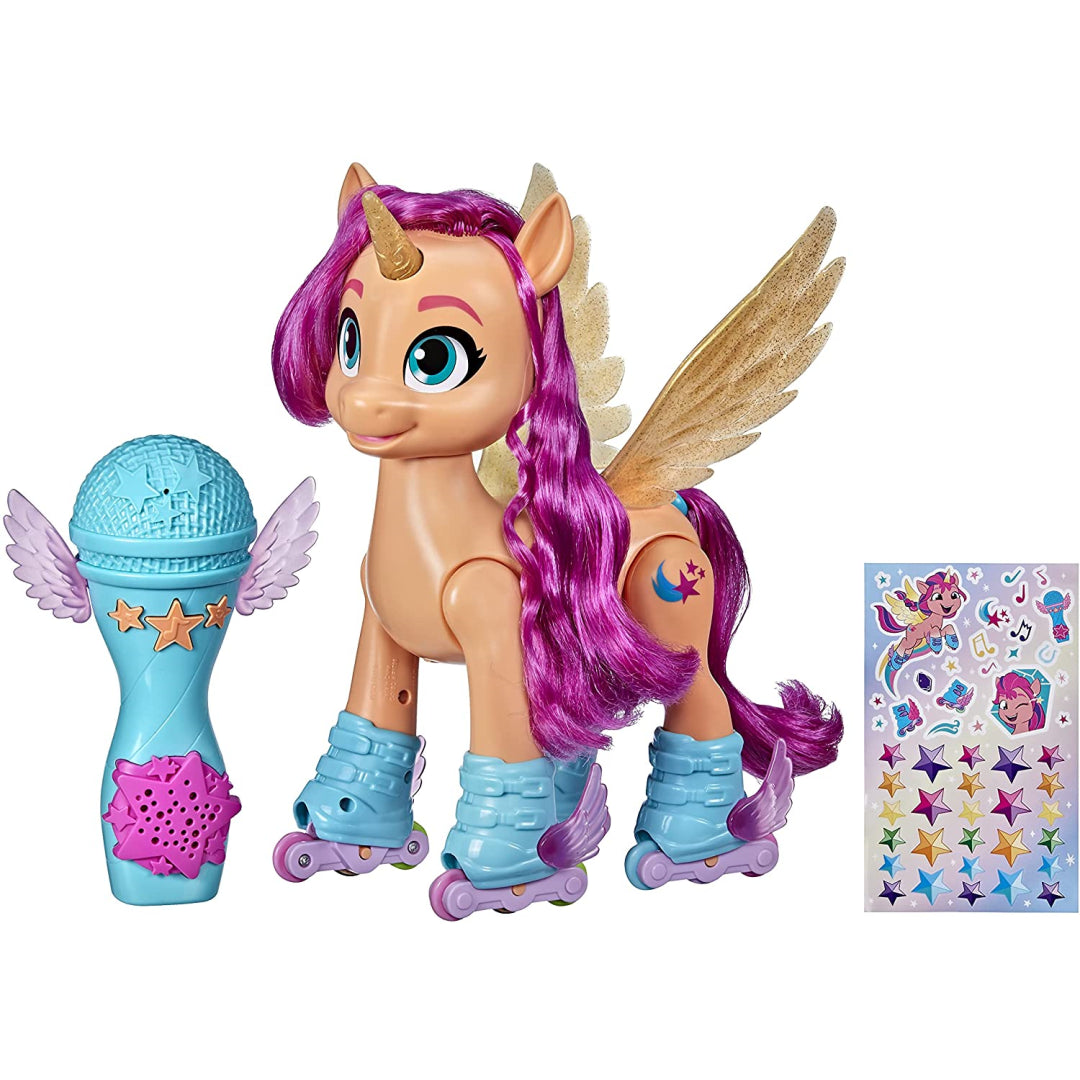 Sunny's roller skates may be moved ahead with the cordless microphone remote control. Sunny imagines movie-style action by moving her head and wings while skating. Sunny can spin around like she's dancing to her smash song "Gonna Be My Day!" from the My Little Pony: A New Generation movie. To observe the figure begin to move, wave the microphone in front of her. Sunny Starscout will go quicker the faster the youngsters shake the microphone!