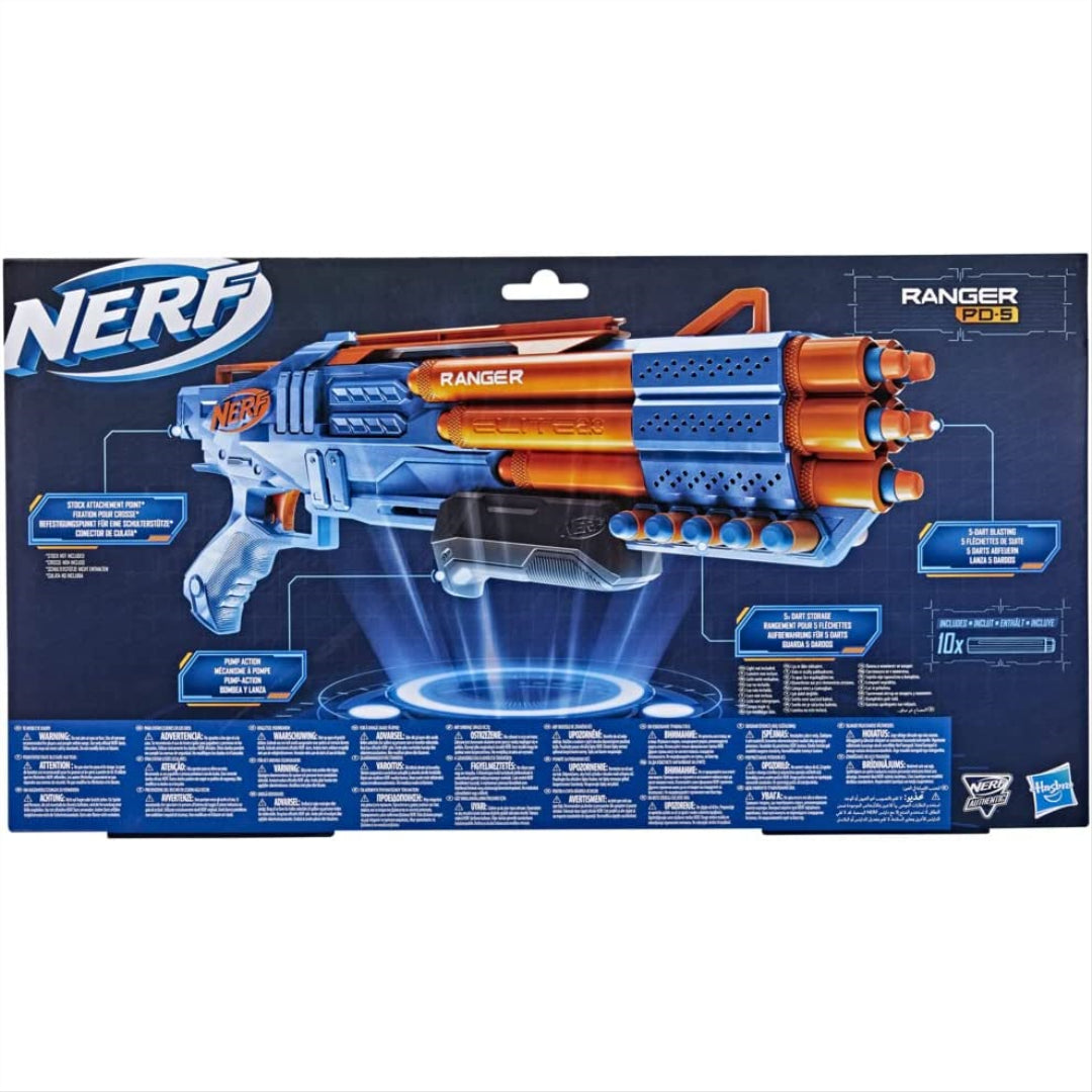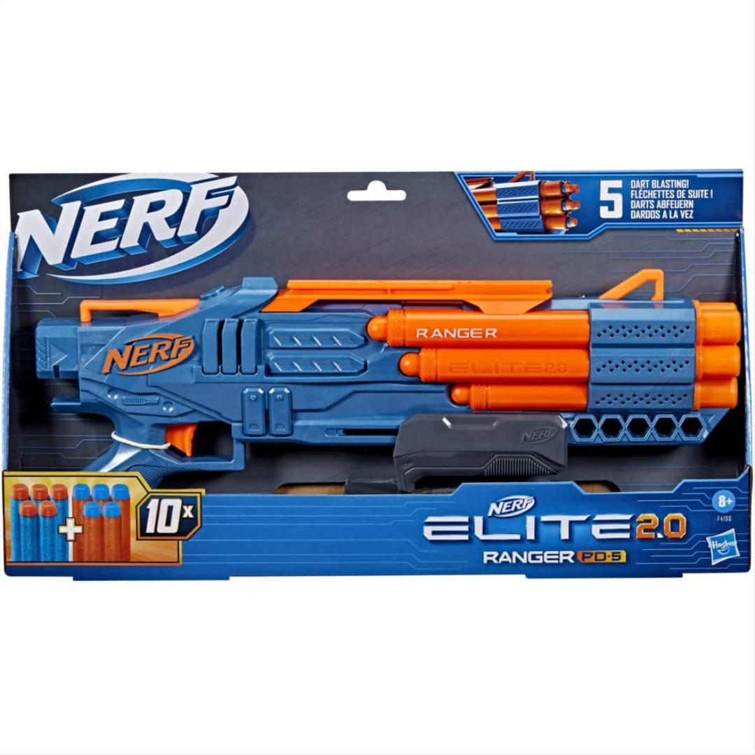 In the heat of battle, take on your foes with the Nerf Elite 2.0 Ranger PD-5 blaster, which has a 5-barrel firing mechanism. This pump-action blaster is simple to use and comes with 10 Nerf Elite foam darts, providing you 5 darts to put into the blaster and 5 more darts for reloads. The blaster fires one dart at a time, and there are no reloads required. You can keep those five more darts close at hand for speedy reloading by putting them in the blaster's integrated dart storage and storing them there. Because the Ranger PD-5 blaster is so simple to use, you'll be able to rush into the fray much more quickly. To fire one dart, you must first load the barrels, then pump the priming slide in both directions, and then squeeze the trigger. You are able to personalise it for each every mission or fight thanks to the tactical rail and stock attachment point. Construct an arsenal of Elite 2.0 blasters to enhance your game strategy, provide superior tactical performance to all of your Nerf games, and give you more tactical versatility. Optical protection is suggested (not included). Additional accessories are available for purchase separately, subject to stock levels.