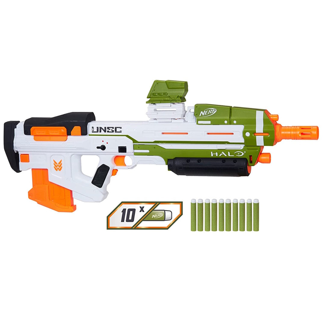The Nerf Halo MA40 blaster was designed to resemble the one from Halo Infinite, the latest installment in this illustrious video game series! Take on the role of the Master Chief and engage the alien coalition in combat! This motorised, clip-fed blaster that shoots 10 darts in a row will test your opponents. It comes with a detachable 10-dart clip and 10 genuine Nerf darts, which is enough to fill the clip completely.