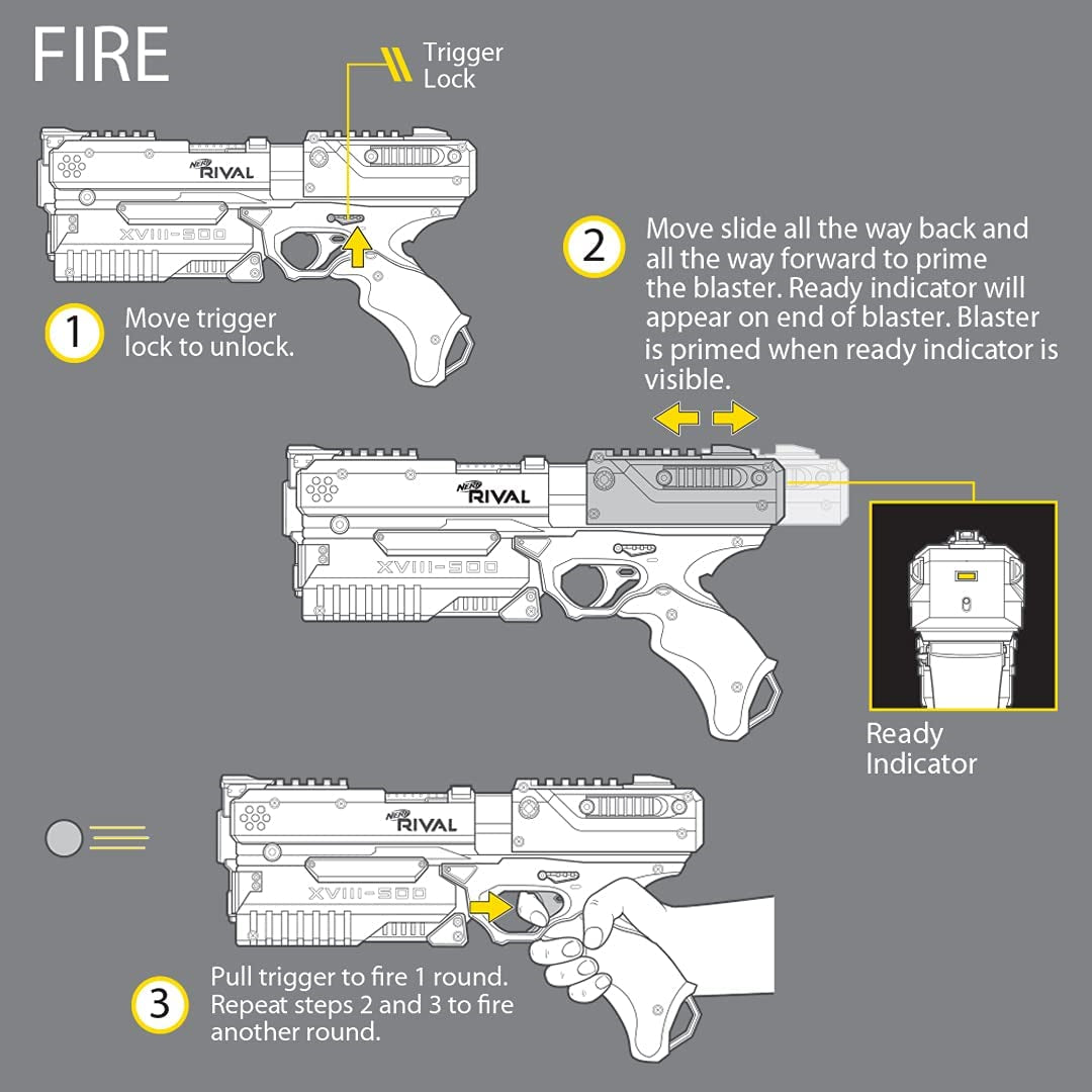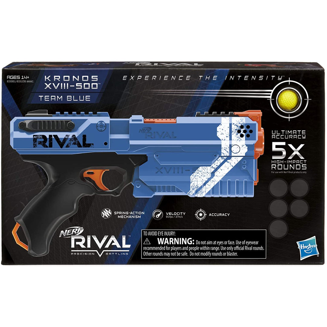With the Nerf Rival Kronos XVIII-500 spring blaster, take on your opponents as a member of the red team! Open the cylinder head to load 5 foam balls, then Nerf tone presses the trigger and pulls a foam ball owing to the spring mechanism. The foam balls are launched at a speed of 27 metres per second by the blaster. The blaster has a trigger lock that prevents it from being mistakenly pulled. When the blaster is fully armed, the status indicator illuminates.
