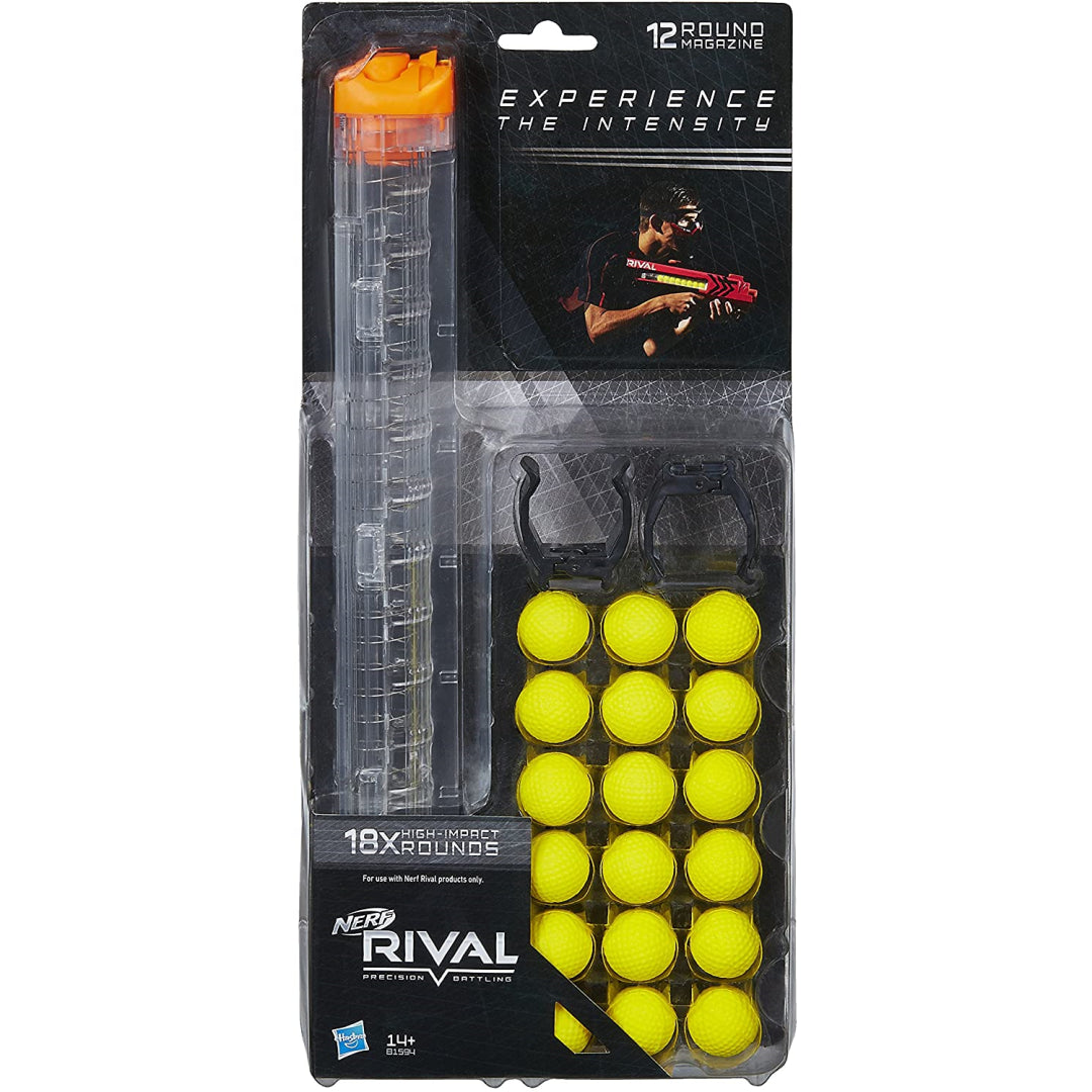 Experience fierce head-to-head action with Nerf Rival's supreme accuracy and strength! This refill pack contains 18 high-impact rounds, a 12-round magazine, and two clips that fit to tactical rails on Nerf Rival blasters to keep you ready for war.