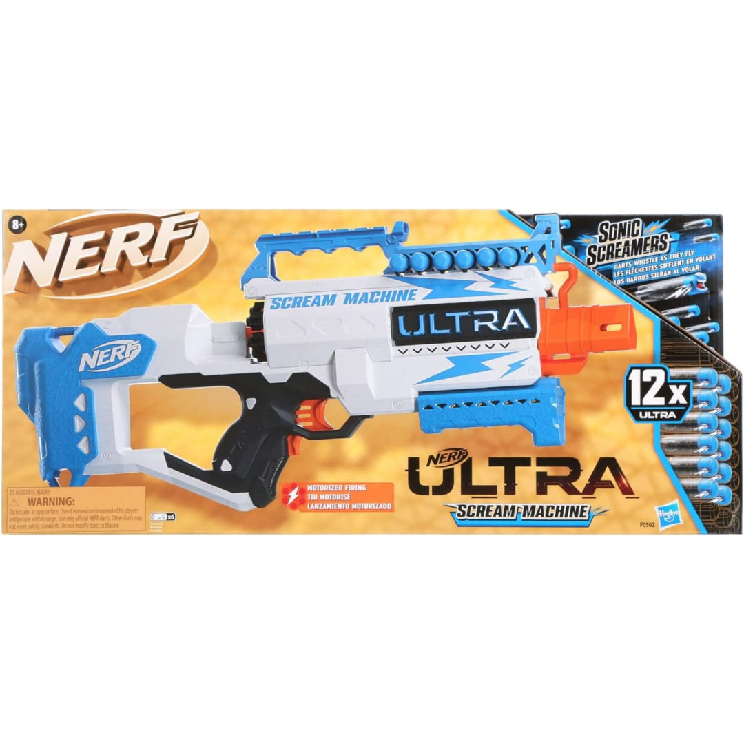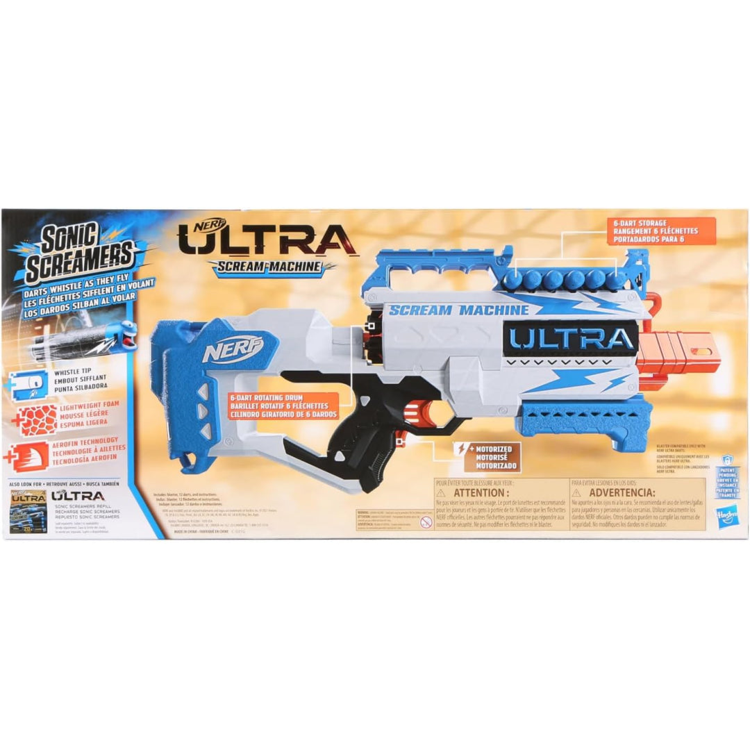 Twelve Nerf Ultra Sonic Screamer darts, which generate a whistling sound as they fly through the air, are included with the Nerf Ultra Scream Machine blaster. Take charge of the action by using the Nerf Ultra Scream Machine to dominate the battlefield and make your voice known! Additionally, you are blasting the darts from this motorised blaster quickly when you release them! To fire one dart at a time, turn on the engine and pull the trigger. Reloading rapidly is made possible by fast back loading. The 6-dart cylinder has an open back that is visible while holding the blaster, allowing you to monitor the remaining dart count and choose when to reload. includes six dart storage on board.