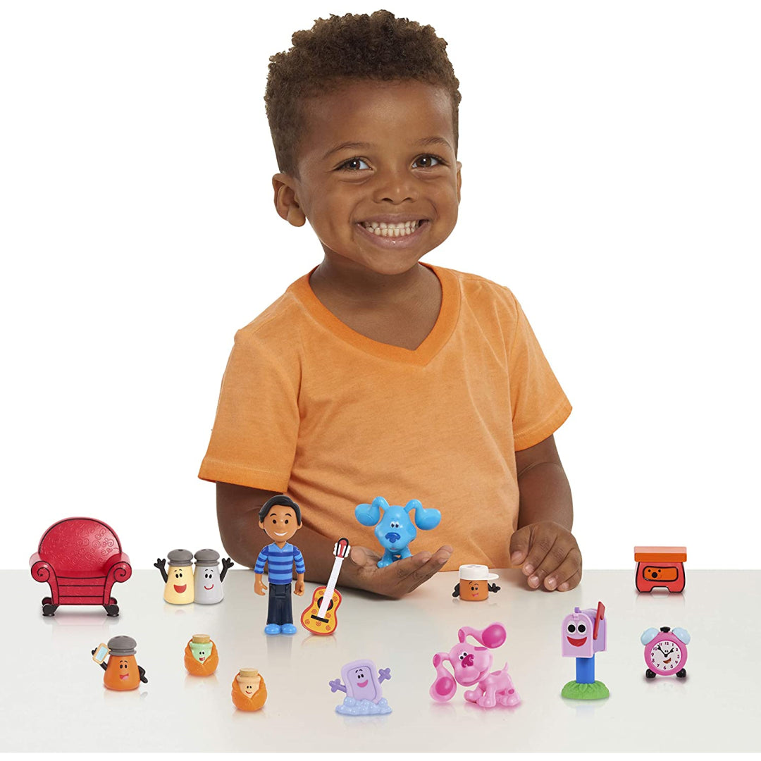It's Blue's Clues & You, step by step and clue after clue. With the Blue's Clues & You, kids may gather all of their buddies from the Nickelodeon classic preschool programme. Play-Along Deluxe Set This figure set, which includes fourteen show-inspired figures and accessories, is the ideal addition to any Blue's Clues & You collection of games (sold separately). Poseable figurines of Blue, Magenta, and Josh are included. Josh's Handy Dandy Guitar is also included in the set, which he may wear. With Tickety Tock and Slippery Soap, kids may recreate their favourite Blue's Clues games. Even the mailbox opens to show a letter. Place Josh next to Sidetable Drawer in the Thinking Chair. Also included are Mr. Salt and Mrs. Pepper, Cinnamon, Ginger, and Sage. Bring the Blue's Clues and You home. Blue's Clues & You Deluxe Play-Along Friends Set, as well as the remainder of the Blue's Clues & You series.