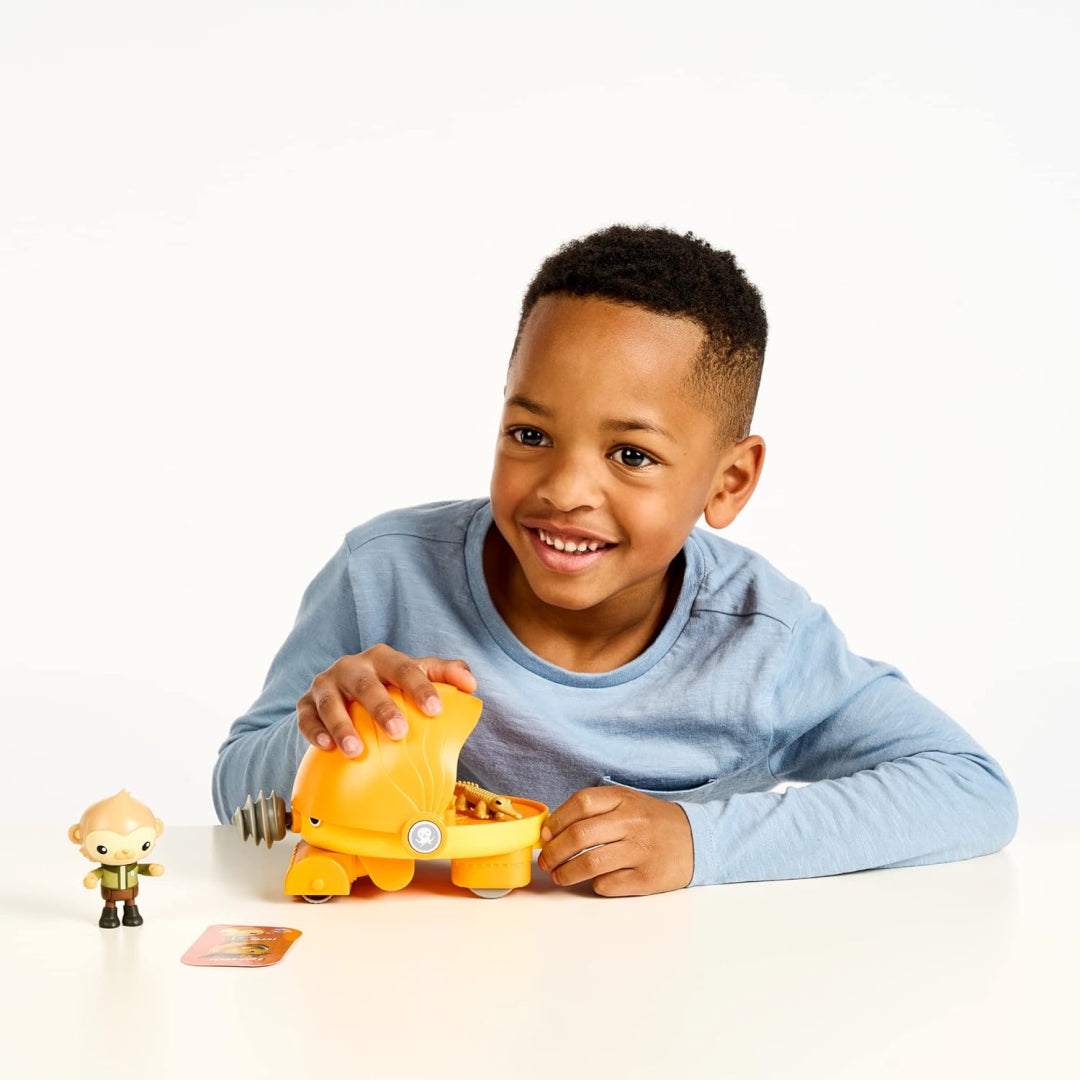 Save the Freshwater Crocodile with 2.8" Paani figure and the Terra Gup 2. The new Terra Gup 2 Vehicle from Octonauts Above and Beyond has a rotating shell cover with a spinning drill. The 4-piece pack includes Paani, Terra Gup 2 Vehicle, Freshwater Crocodile, and Mission Card.