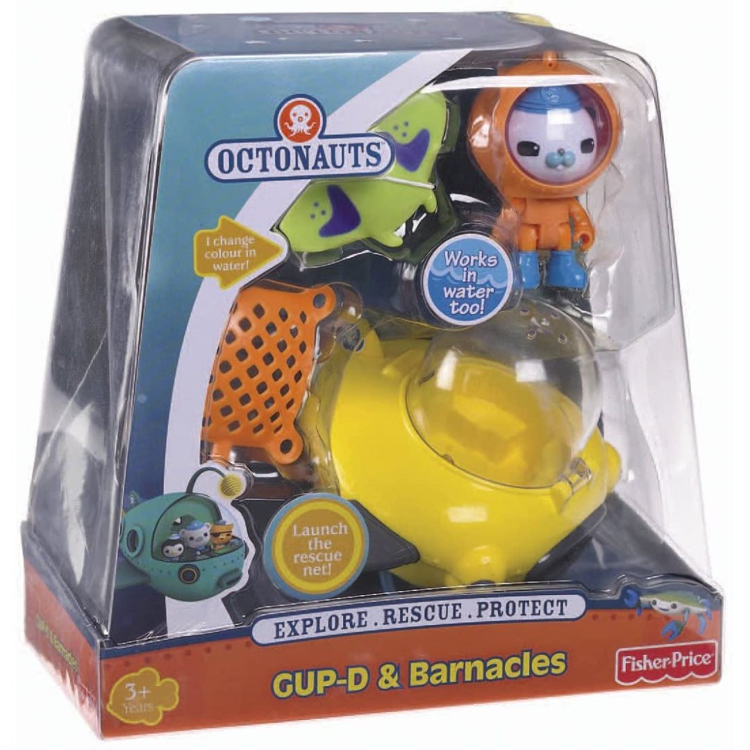 Take Barnacles out of the dome and into his favourite submarine transportation vessel. Roll the Gup-D across the floor, then press the fin to deploy the rescue net from the bottom of the Gup-D. Water makes Gup-D float, and you can attach the air line to Barnacles' diving tank to have him rise and fall through the water. Octonauts Gup-D Barnacles and Manta Ray Playset includes everything you'll need to explore the amazing underwater world of the Octonauts and its inhabitants. For children aged three and above.
