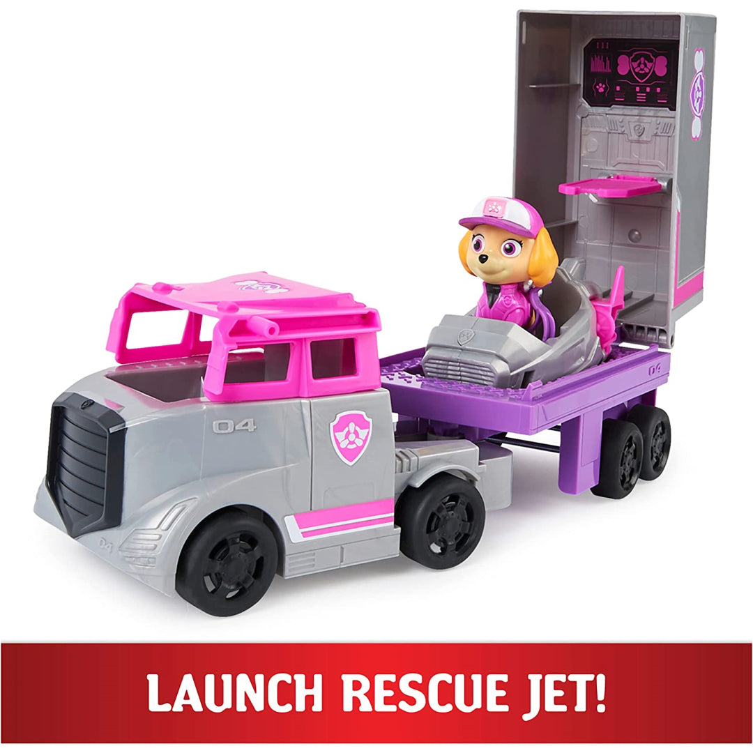 Join forces with Skye as she navigates the perilous terrain of the roadway in her Big Truck Pup - Rescue Truck. Skye's big rig rescue truck goes through an interesting transition at one point in the story. Simply raise the roof of the truck cab to allow Skye to enter and exit the driver's seat, and then raise the roof of the trailer to activate the command centre mode. This mode transforms the truck trailer into a two-story command centre and exposes Skye's rescue jet, making it the ideal rescue vehicle for high-speed rescue missions on the highway and in the air! A child can exercise their creativity and develop their motor skills through pretend play with PAW Patrol toys. As they relive their favourite scenes from the show, such as the Mighty Pups and the PAW Patrol Movie, or create entirely new adventures, with all of the PAW Patrol pups, the child can explore his or her imagination and develop their motor skills (each sold separately). Bring home the Big Truck Pups action figures and their team vehicles for uncountable hours of fun-filled, action-packed adventures (each item is available individually), and you'll have access to even more fun and thrilling missions inspired by the series!