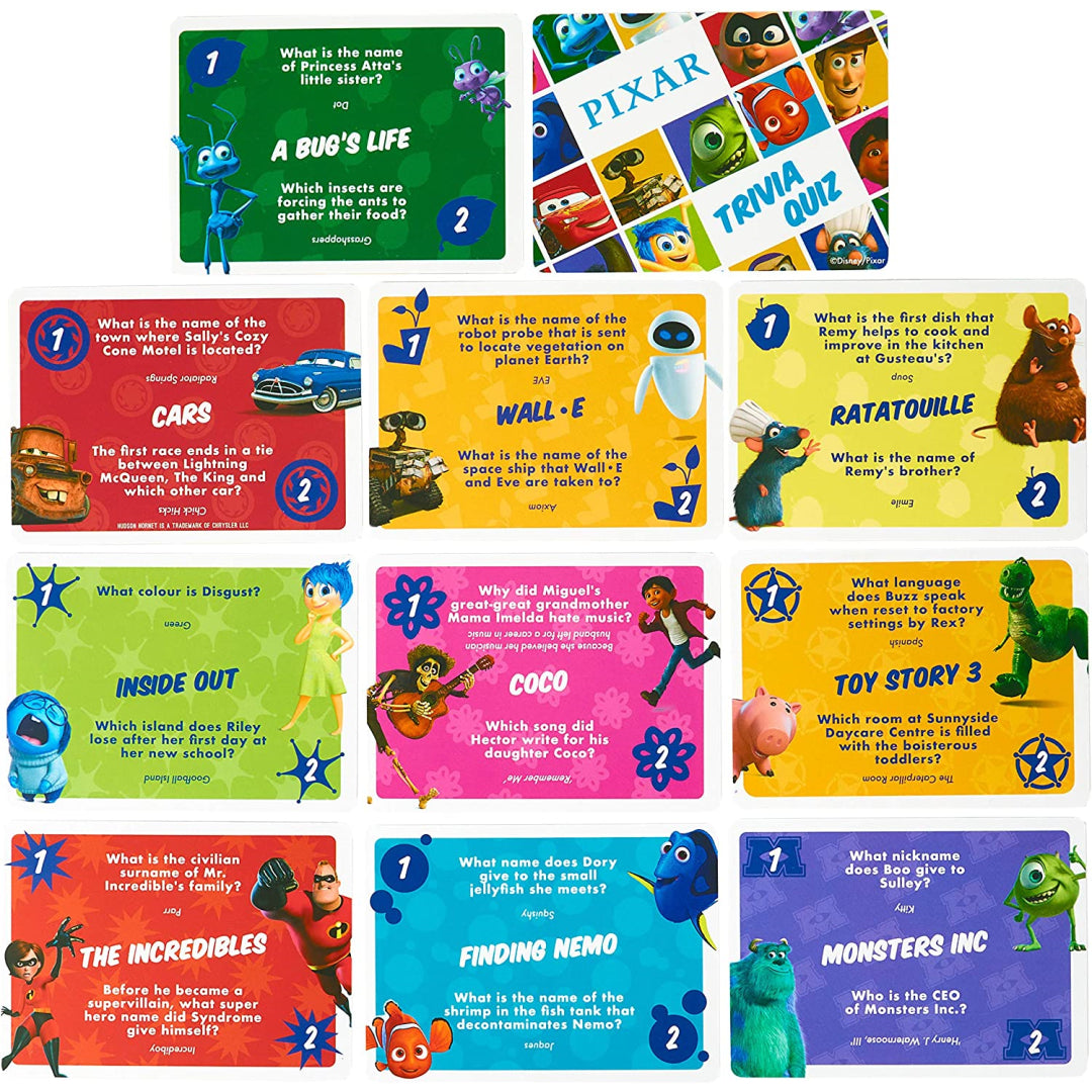 Which of the three films Toy Story, Monsters, Inc., and Finding Nemo is your favourite Pixar film? You may demonstrate how much you know about the films that were made by this incredible computer animation company by using our Pixar Trivia Quiz, and you can also test the knowledge of your family and friends by using it. What kind of fish does Nemo belong to? Who serves as the Chief Executive Officer of Monsters, Inc.? You, your friends, and your family will be able to find out how much you have learnt from viewing these great movies by responding to the 100 questions that are included in the quiz. Along with comprehensive directions for playing the game, the package contains everything you need to get started right away. Because of its compact size and low weight, the Pixar Trivia Quiz is an excellent choice to bring along on a vacation or other extended trip. Included in the purchase price is a box with a euro hook slot, as well as fifty different quiz cards, one instruction card, and detailed gaming instructions.