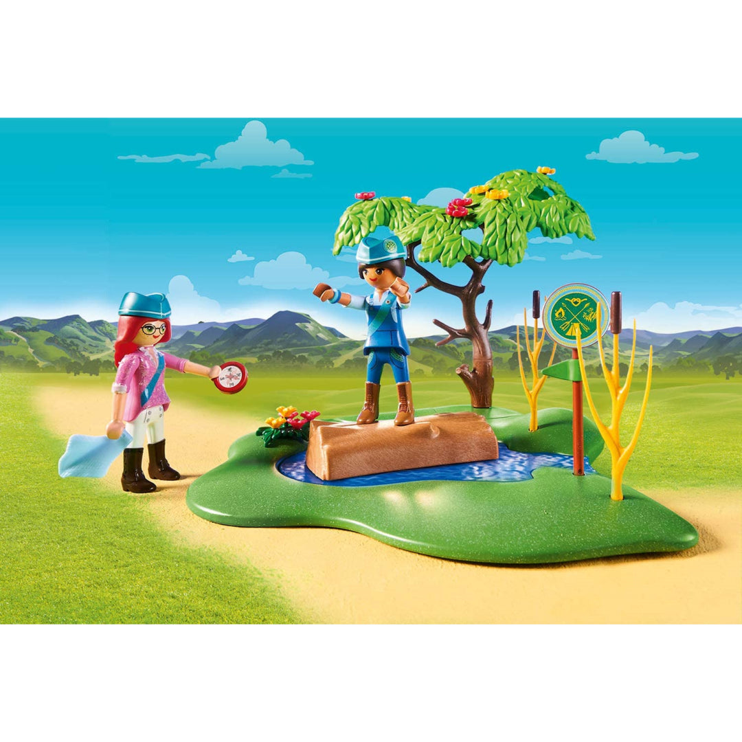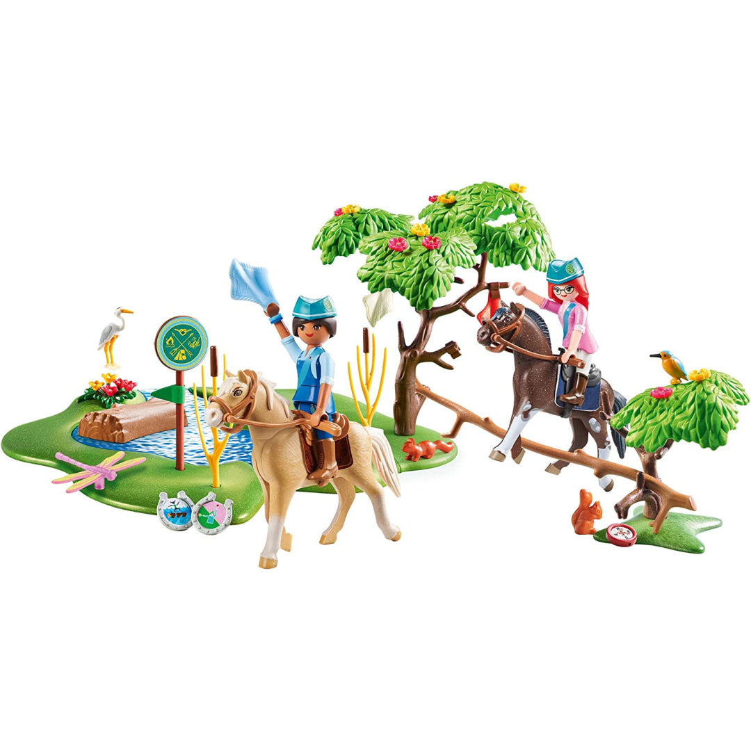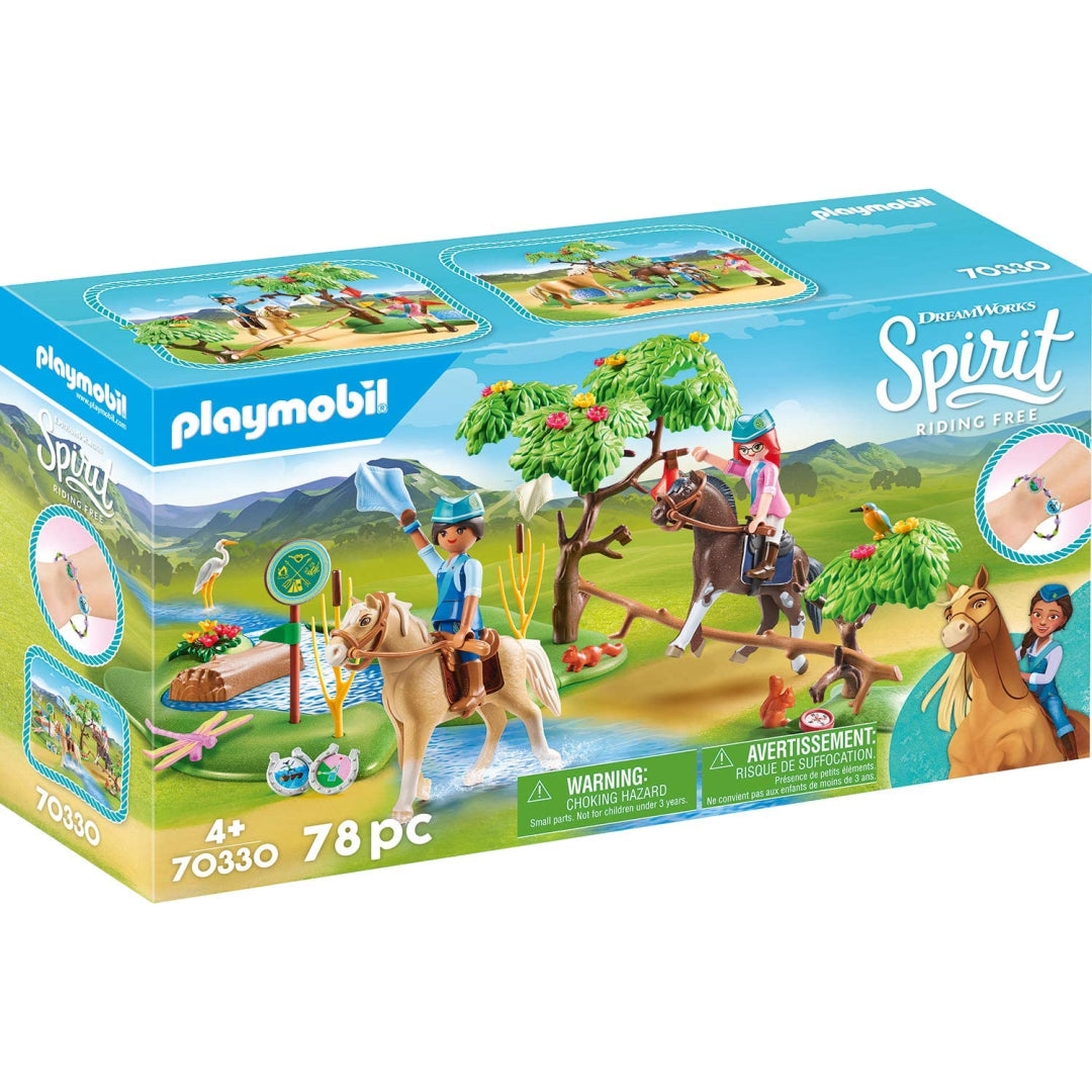 Lucky will need some time to adjust to life in the Wild West after moving from the city to the countryside. It's a huge adjustment for her compared to her life in the city, and she really misses her friends. Shortly thereafter, Lucky befriends Abigail and Prudence, comes into contact with the wild Mustang named Spirit, and the beginnings of an extraordinary friendship are formed... The PLAYMOBIL River Challenge forces groups of friends to contend with a variety of fresh challenges, such as navigating around a nearby tree branch that has been placed in the middle of their path. The friendship between the friends and their horses is deepened as a result of this. Additionally, this playset comes with a collectable bracelet and a badge that can be traded with other people.