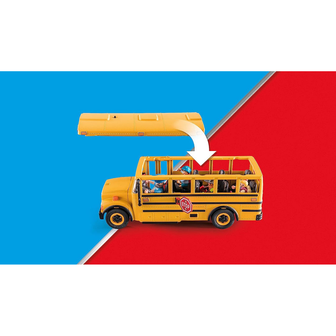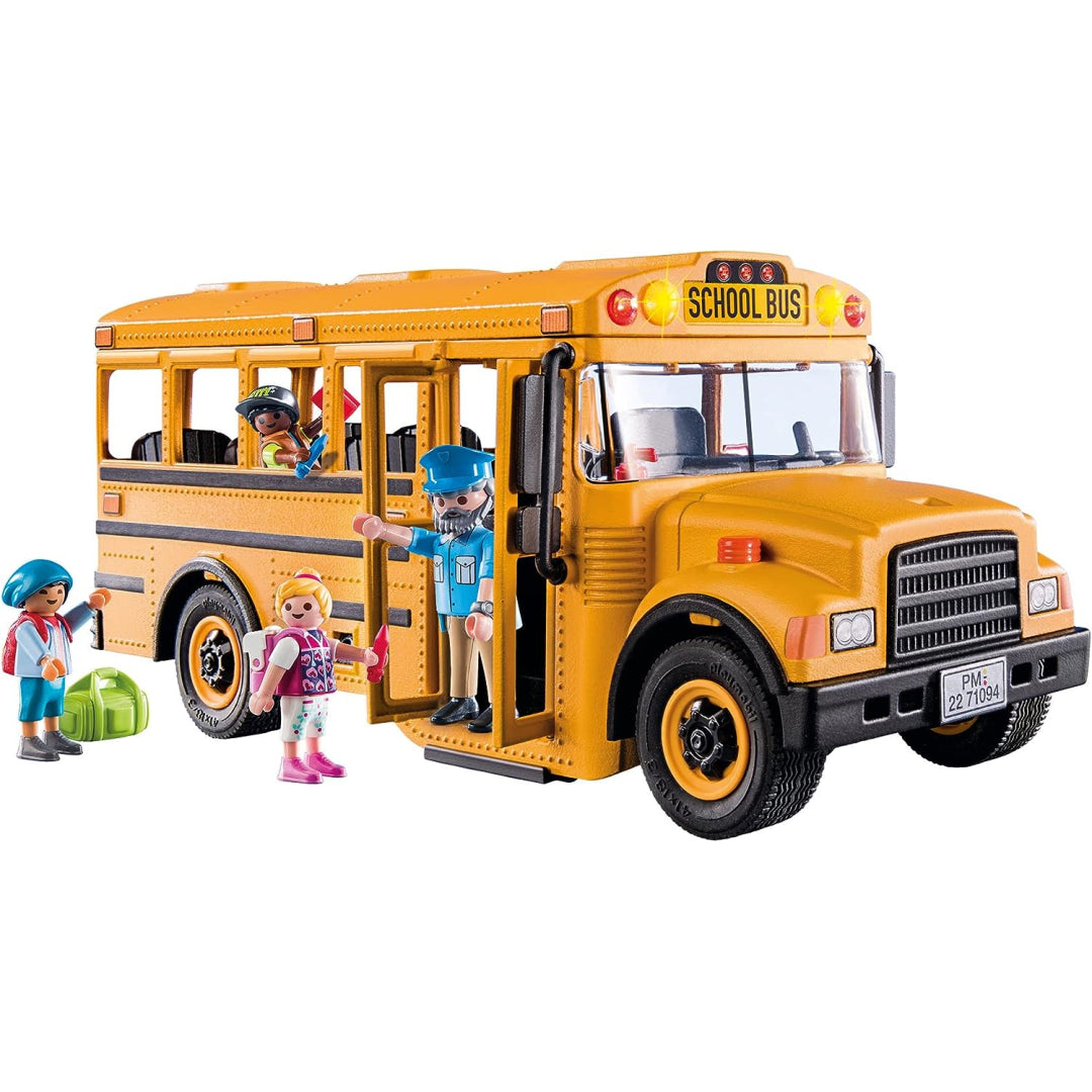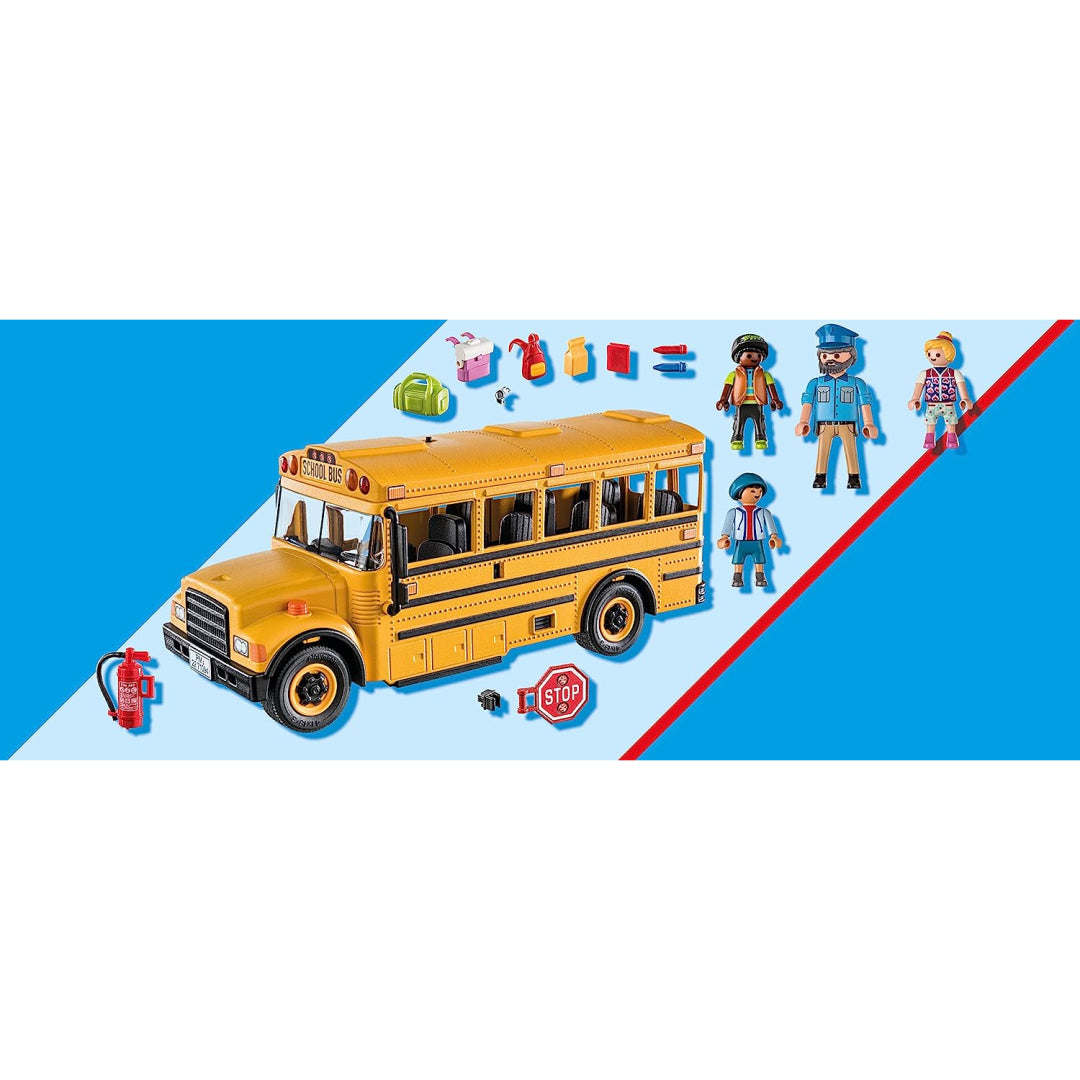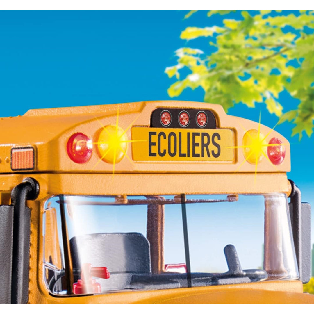 Time for classes! Take the school bus out for a day of learning. The bus driver stretches the stop sign as he reaches the bus stop, and the working front and back lights flash. The youngsters may board and choose a seat once the double doors open. The retractable top makes it simple to access the roomy inside, which has space for up to seven people. Bus driver, three kids, lunch bag, backpacks, pencils, and other accessories are all included in the set.