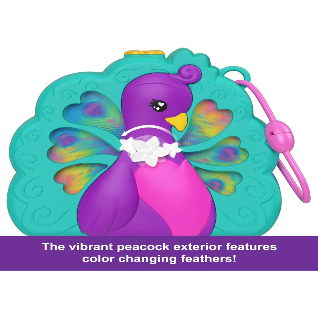 Greetings from paradise! Twelve accessories, including many critters, and two mini dolls are included with this Polly Pocket Peacock Garden Compact. On the outside is a vibrant peacock with entertainingly fidgety feathers. Crack up the compact to find an animal haven! With elements like a peacock swing that swings back and forth, an opening door on the gazebo, and a boat-shaped pool, be ready for the ultimate storytelling experience. While enjoying a tea party in the yard with a flamingo buddy, tie your pet monkey to the palm tree. The sunset is stunning! For enjoyment on-the-go, take the compact with you wherever. Perfect as a present for kids four years old and older, particularly those who like taking trips!