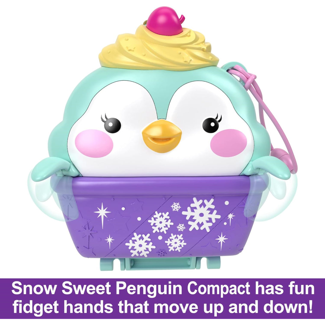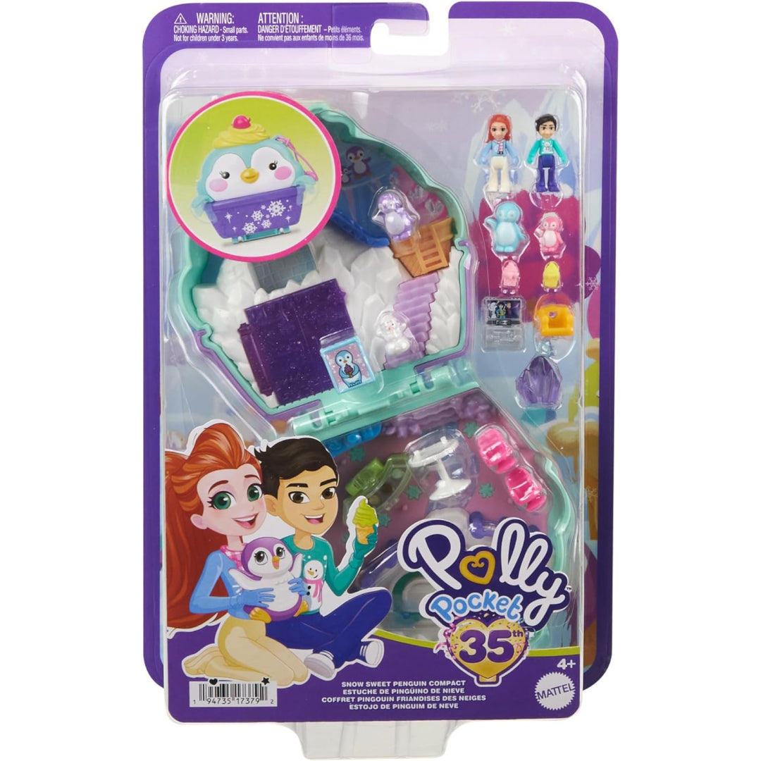 For the ultimate snow day fun, this Polly Pocket Snow Sweet Penguin Compact comes with six narrative elements, thirteen accessories, and two tiny dolls! The compact unfolds to reveal a fantastic winter wonderland and has a charming penguin ice cream shell with fun moving fidget hands! With features like a moving snowman, a freezer door that opens to a cosy residence, and a quick igloo slide ideal for dolls and penguin pets, be ready for the ultimate storytelling experience! Dolls are able to skate in the snow and clip onto the ice rink! Friends who are enjoying a delicious frozen treat may watch from the ice cream store! For entertainment on-the-go, take the compact with you wherever! Perfect as a present for kids four years old and older, particularly those who like the cold and snow play!