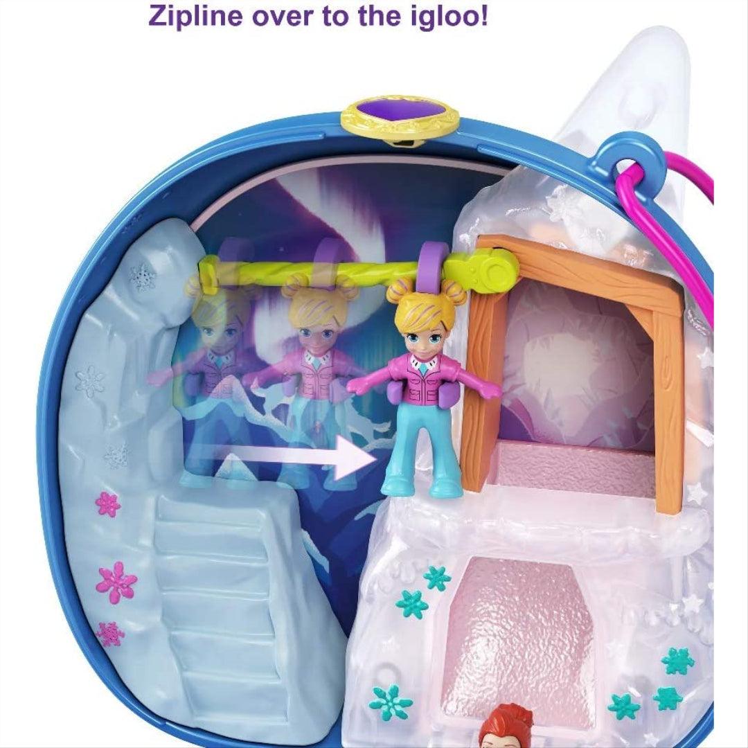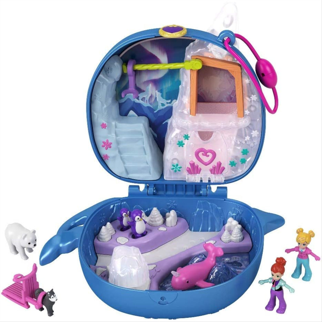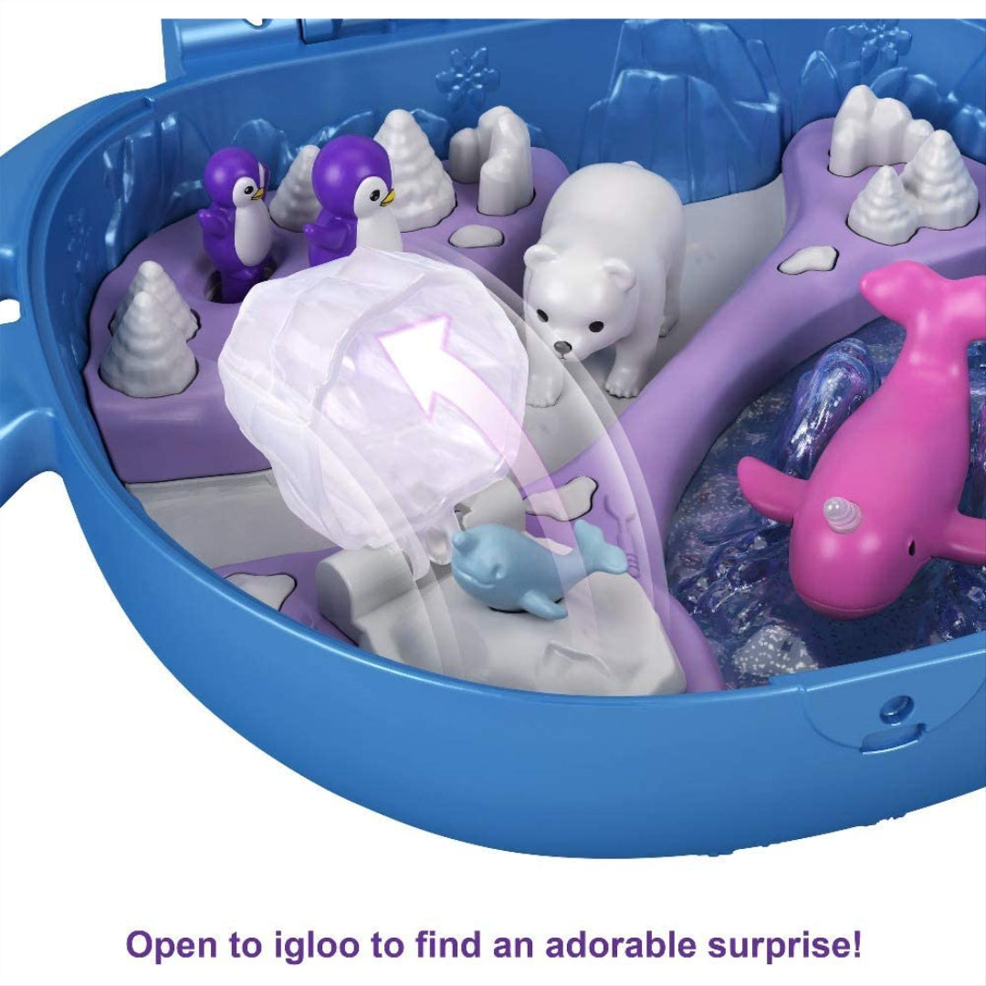 Inside this frosty wonderland, you'll discover a miniature Polly and Lila doll, plus adorable arctic friends including a husky with a sled and a polar bear. Watch as the narwhal's tail rises with a press, revealing hidden surprises like a baby narwhal tucked inside an iceberg and two moving penguins. Your little ones will love sending Polly and Lila zooming down the igloo slide or gliding across the snow on the husky's sled.