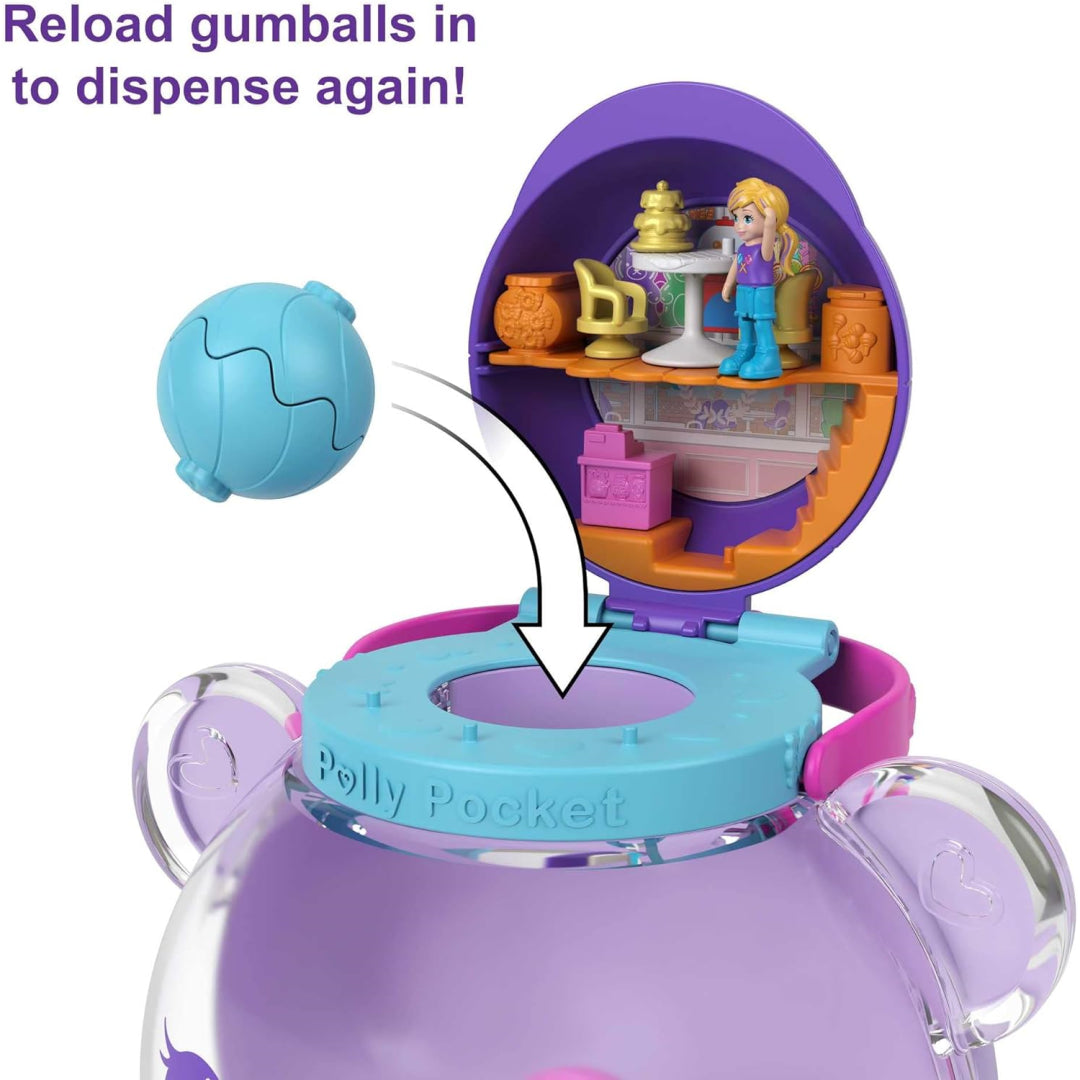 Discover sweet savings with this adorable Polly Pocket Gumball Bear Playset that's packed with play value! Perfect for imaginative playtime, this clever gumball machine transforms into four different play zones with 32 fun pieces, including mini Polly Pocket dolls and surprise-filled gumballs.