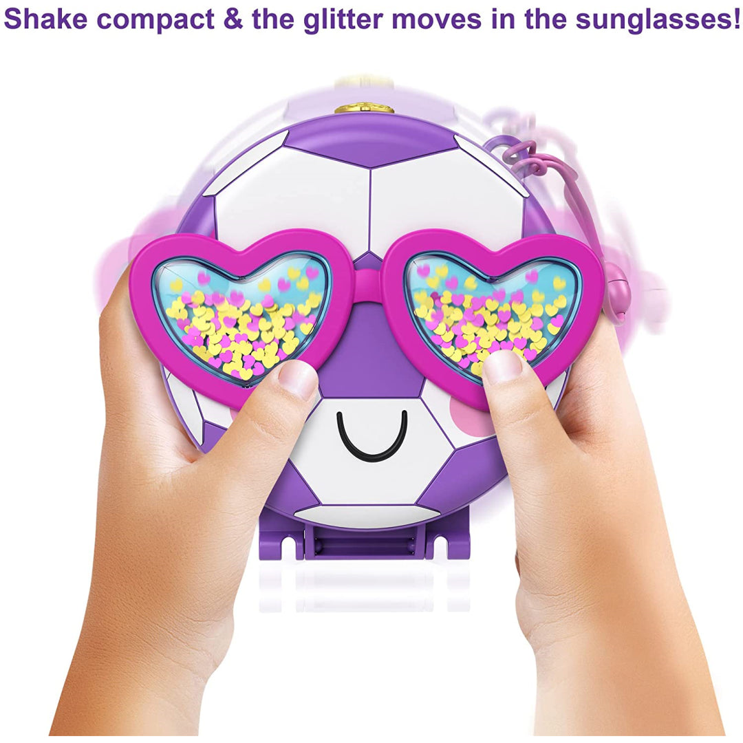 Get ready for Polly Pocket's Tiny Sports Adventures! This Soccer Squad compact has a football design on the exterior with beautiful sunglasses filled with shakable glitter, making it perfect for play at home or on the move. When you open the compact playset, you'll find a fun sports-themed journey with 5 surprise and delight elements, 12 accessories (some with a Pop & Swap peg function), and 2 mini dolls.