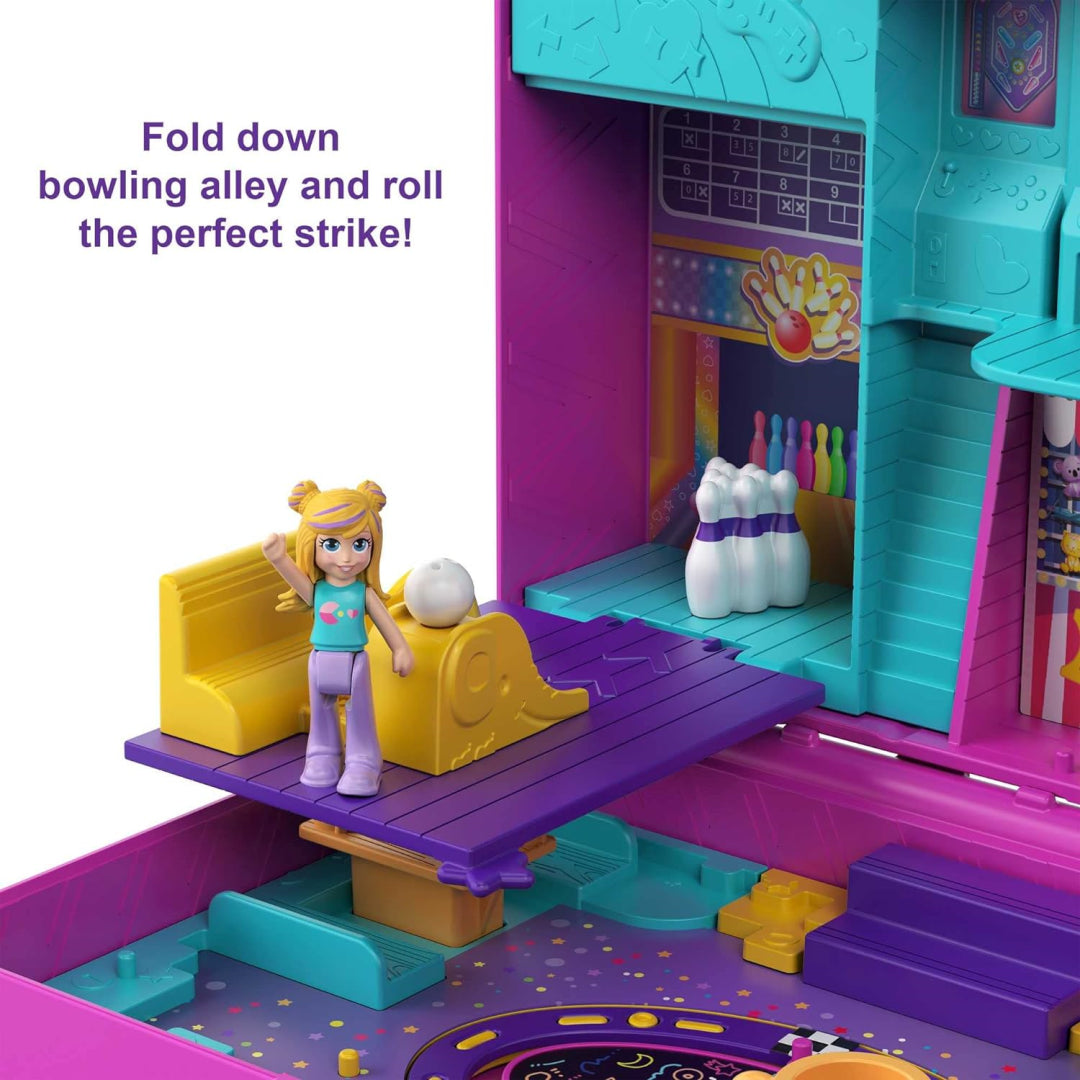 Inside, discover a complete entertainment centre featuring a dance floor, bowling alley, and go-kart track. The fold-down TV screen reveals three different games for Polly Pocket and Shani to enjoy. With twelve mix-and-match accessories and Pop & Swap dolls that can be pinned throughout the compact, your children can create endless gaming stories.