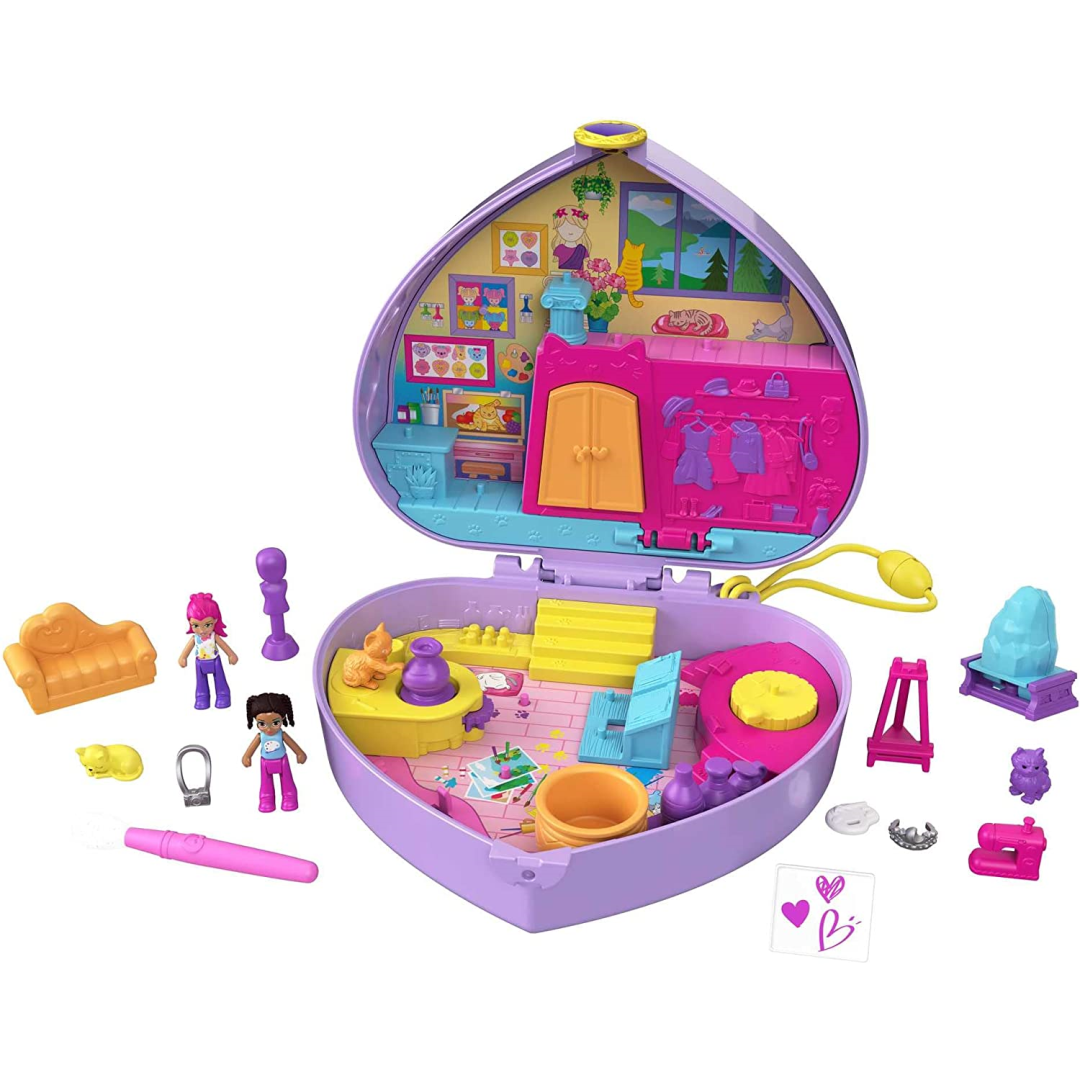 Unleash your little one's creativity with this adorable Polly Pocket Art Studio compact! Perfect for busy families who love to take their fun on the go, this heart-shaped case features Shani and her friend in micro-doll form, ready for artistic adventures. The compact comes with 12 accessories including a special paintbrush that reveals magical colour-change backgrounds when used with water!