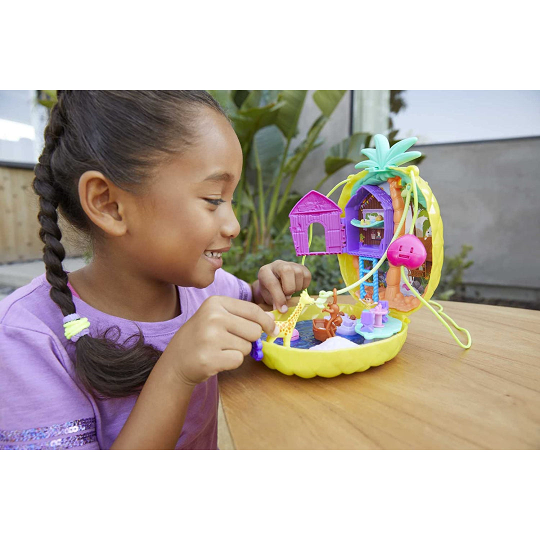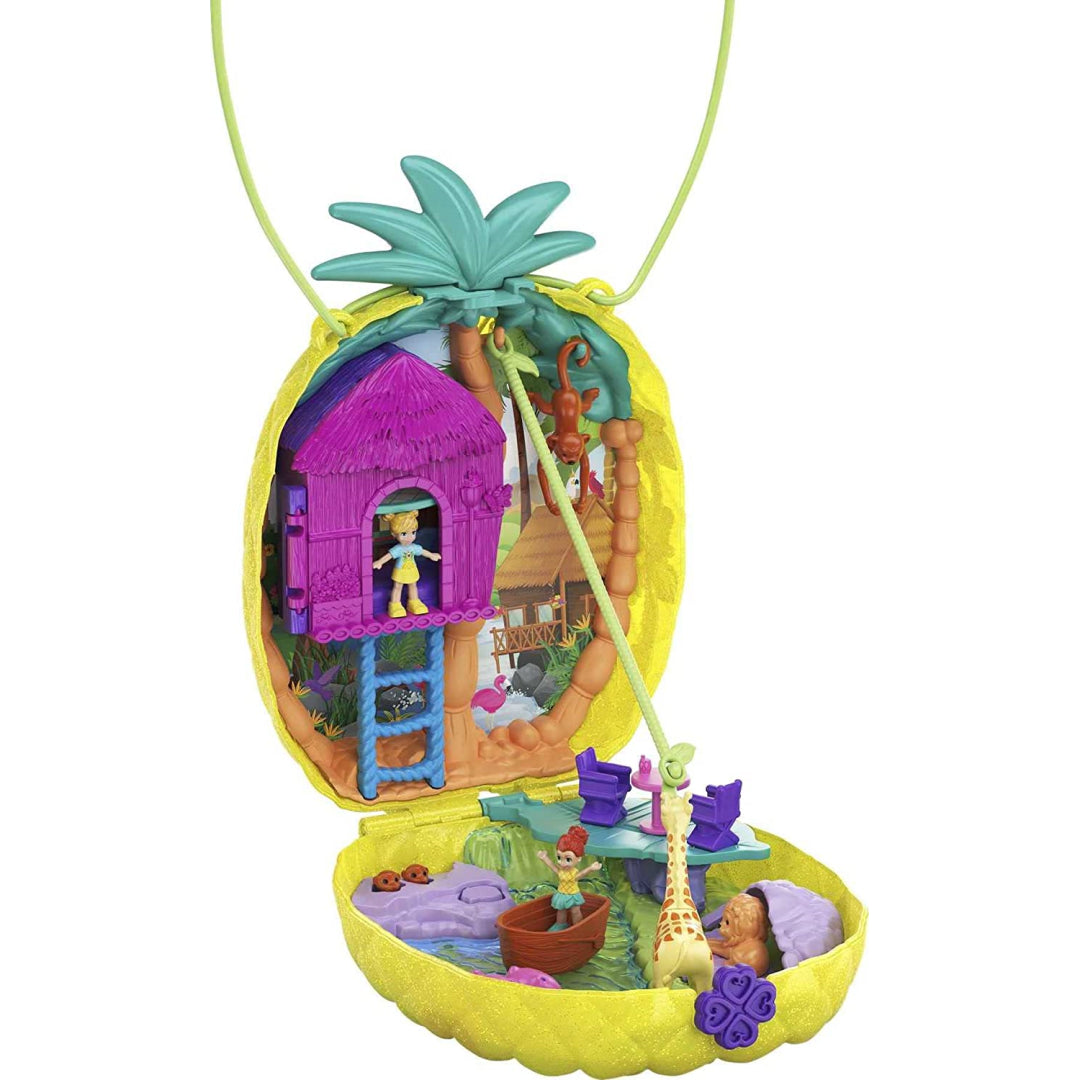 The miniature Polly and Lila dolls, as well as eight other entertaining features, a monkey, and a boat, are all included in the Tropicool Pineapple purse compact. You may carry it as a handbag by using the strap, or you can convert it into a fanny pack by using the belt!