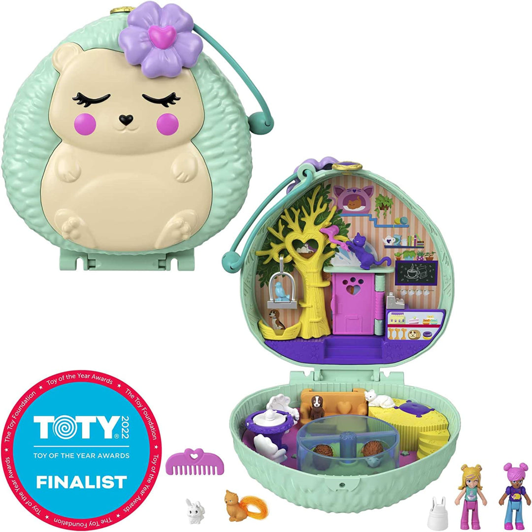 It's time for another adventure with Polly Pocket and Tiny Pawprints! The larger-sized Hedgehog Café compact is formed like a charming hedgehog and unfolds to show a micro café as well as a play area for pets. This toy is ideal for play either at home or on the move.