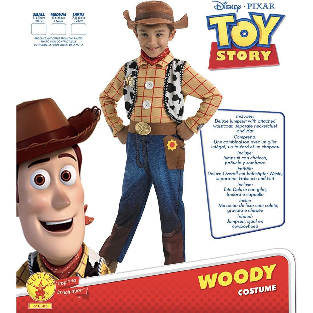 Disney's Toy Story franchise features a toy cowboy character named Woody. Little Disney devotees who want to go trick-or-treating as their favourite character on Halloween or participate in other events that require fancy dress throughout the year will find that our Woody costume is an excellent choice. This ensemble is comprised of a yellow shirt with a printed check pattern, a printed cowhide waistcoat with blue trousers, a red neck tie, and a brown cowboy hat.