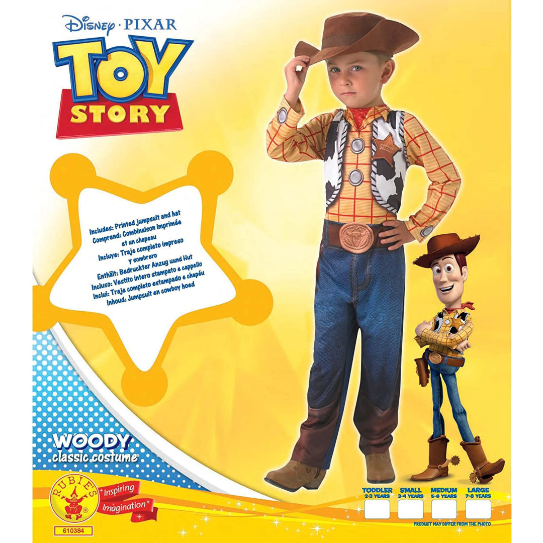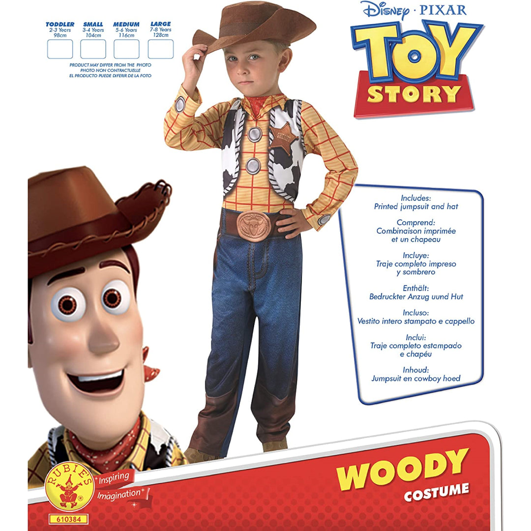 Looking for a budget-friendly way to make your little Disney fan's dreams come true? This Rubie's Toy Story Woody costume is perfect for imaginative play and special occasions! Get ready for your little sheriff to round up some fun in this authentic-looking outfit that includes a printed yellow check shirt, printed cowhide waistcoat, and blue trousers. Complete with a brown cowboy hat and red necktie, this Large (128cm) costume has everything needed for endless adventures.