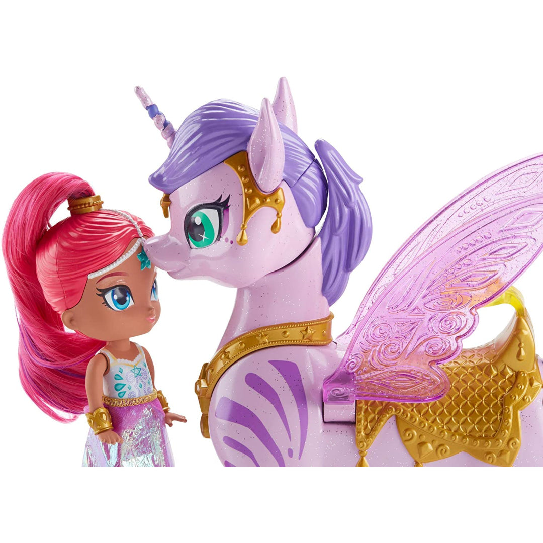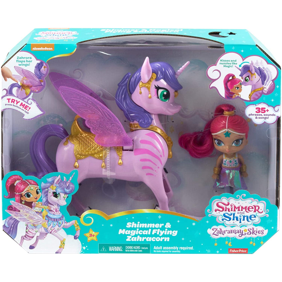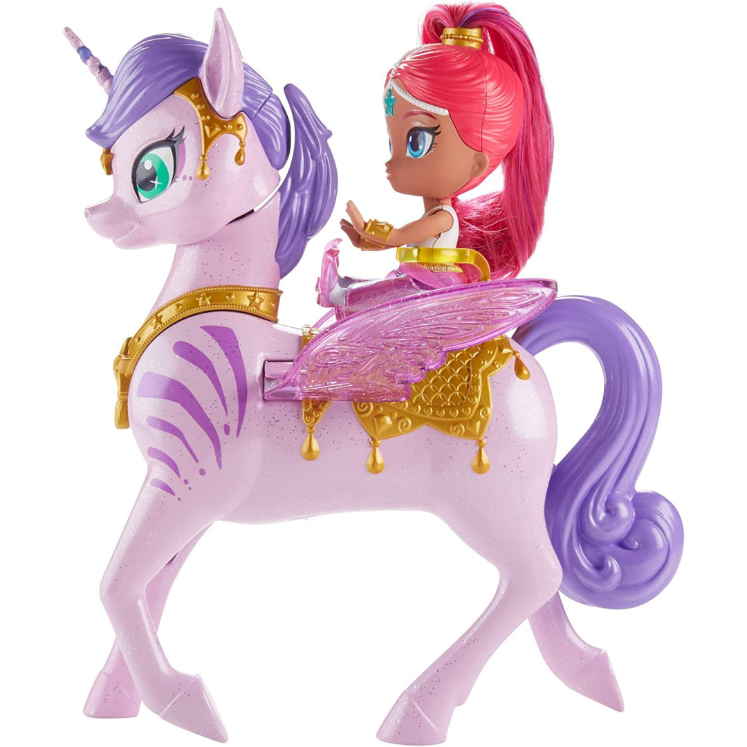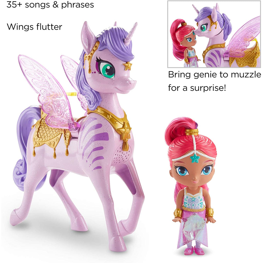 Meet Zahrora! She is a magical flying Zahracorn that belongs to Shimmer. The genies of Shimmer and Shine ride their winged Zahracorns into the enchanted land of Zahramay Skies in some episodes of the show. These lovely Zahracorn toys come to life with realistic flapping wings, over 35 noises, phrases, and melodies, and a surprise of their own! They were inspired by the magical moments that were seen on television. When children bring the genie dolls near to the Zahracorns, the Zahracorns will nuzzle and kiss the genie dolls in a loving manner. The youngsters may have even more fun by using the tail of the Zahracorn as a grip to act as if they are flying over the Zahramay Skies! The Zahracorns have shimmering pink wings and golden saddles that are suitable for the genies to ride on. The dolls have a height of roughly 15 centimetres (6 inches) and are outfitted with an iridescent skirt, shoes, and genie bracelets that match each other. They have interesting colour streaks in their hair, which will make it fun for children to brush and style their hair.