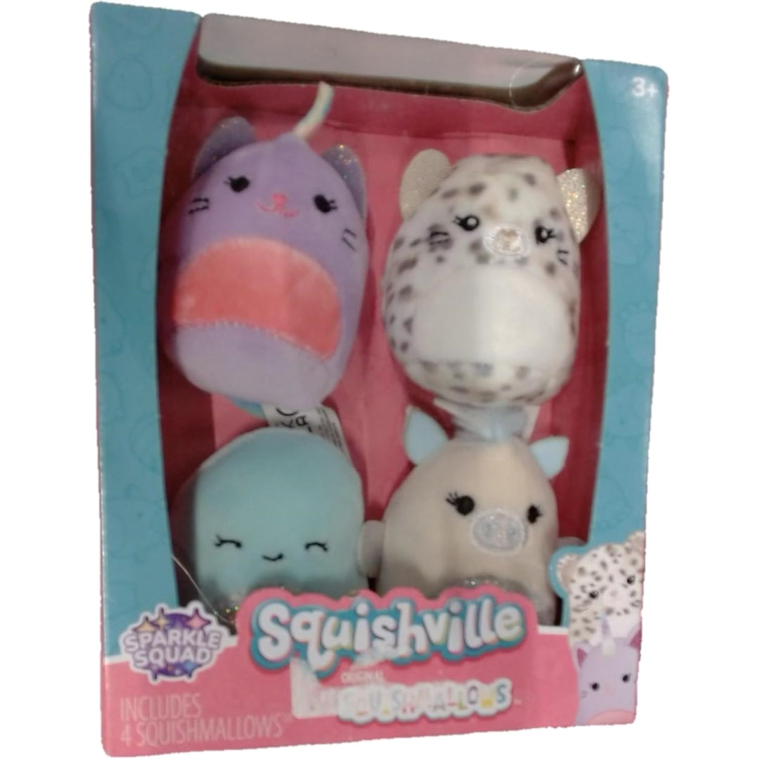 Let the sparkles fly with these super-cute Squishmallows Squishville Sparkle Squad plushies! Perfect for both playtime and collecting, this adorable 2-inch set includes glam versions of Mina, Darby, Nara, plus a surprise squad member to discover. Each Squishmallows mini is crafted with special sparkle fabric details that make them truly dazzle.