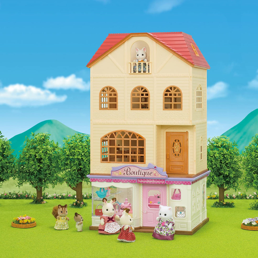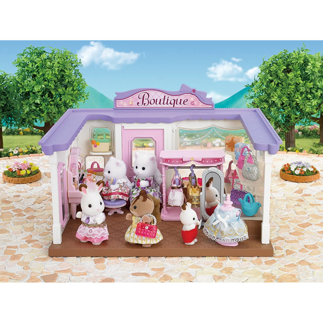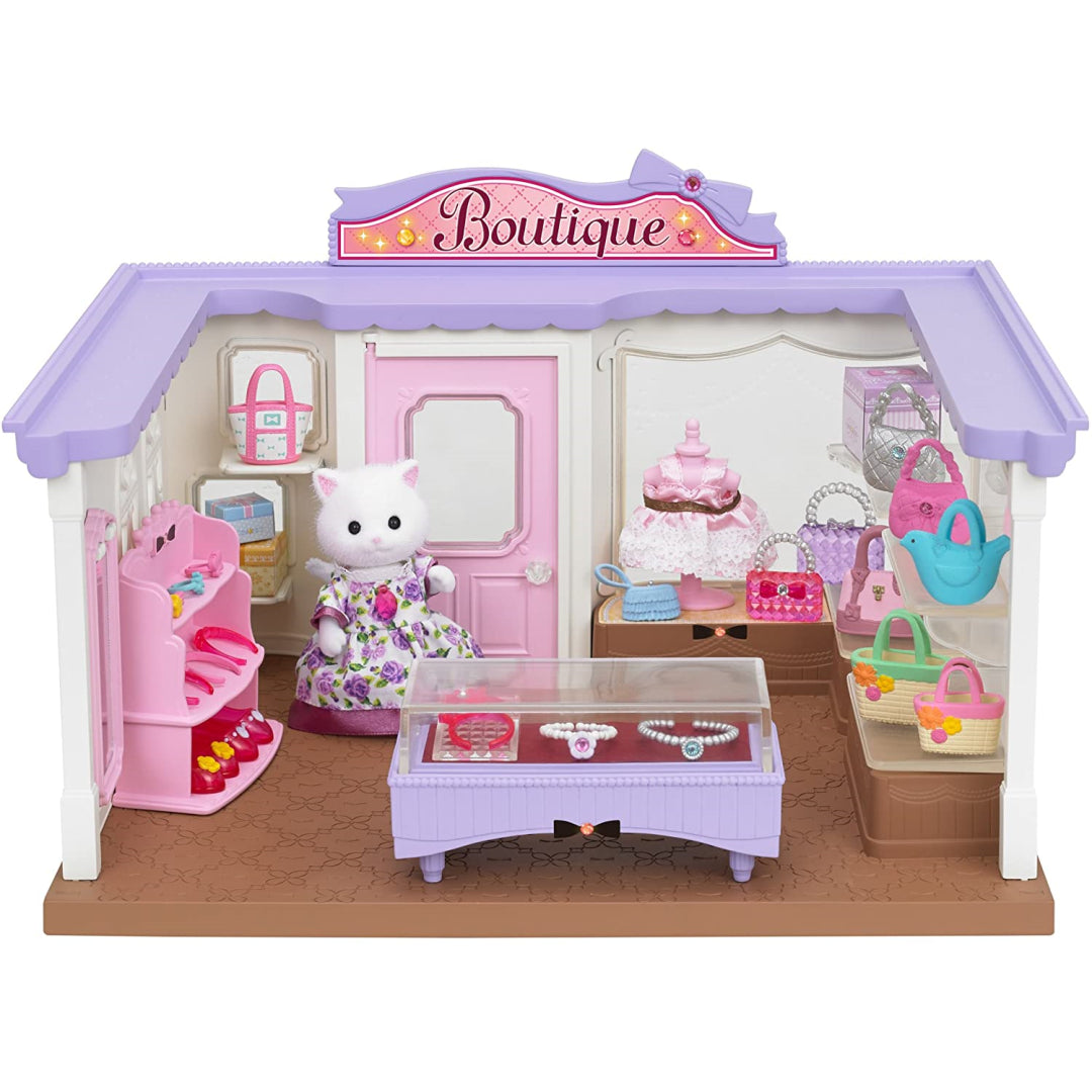 There are many accessories, such as purses, jewellery, and outfits, that you may use to build up your boutique in the store window and display case.br> With this glitzy new store, you can shop 'til you drop! Cecilia Teak is a fashionista who has created a fantastic line of bags, shoes, jewellery, and accessories for your fashionable Sylvanians to purchase! She's even dressed up in a special gown for the occasion; just watch her spin! With a variety of shoes, enticing jewellery, and a plethora of adorable purses, your Sylvanians will be enjoying their new appearance all day!