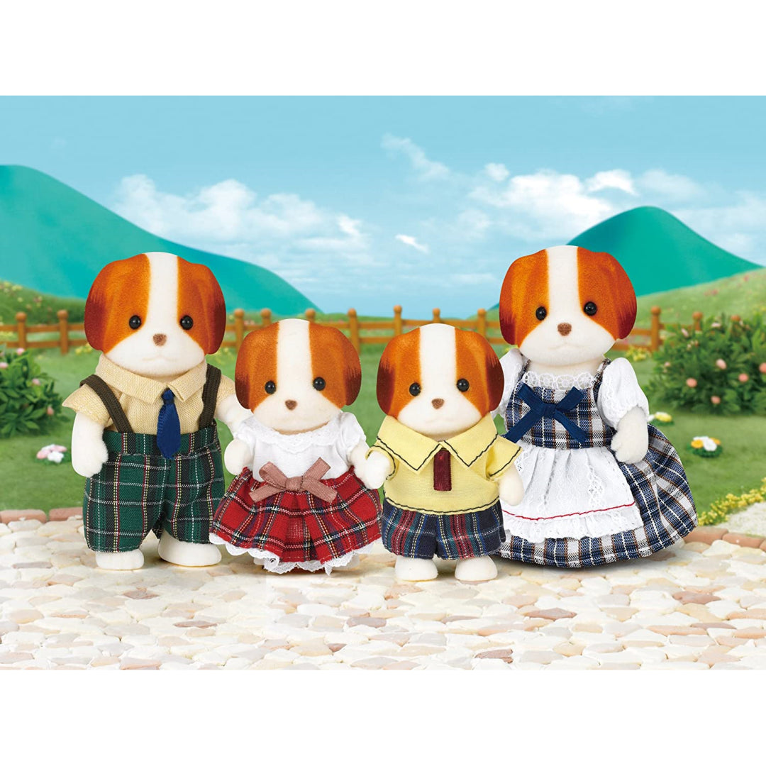 Posable collectible figurines of chiffon dogs. Four-piece set: brother, sister, mother, and father all wearing textile garments that can be taken off. Encourages youngsters to assume creative roles; appropriate for ages 3 to 10.