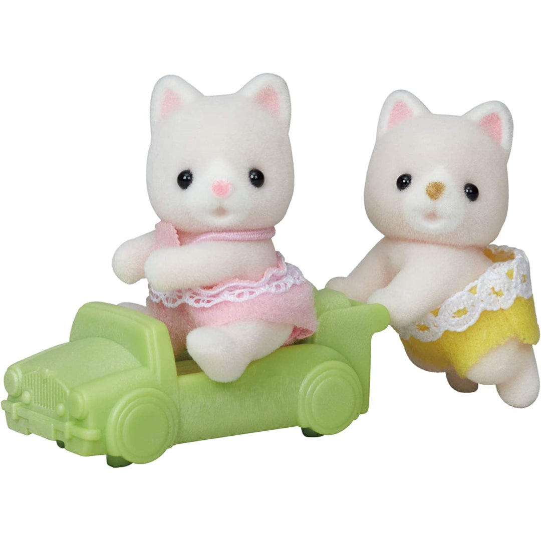 Along with two different figurines of the Silk Cat twins—one seated and the other crawling—the Silk Cat Twins set also comes with a ride-on toy. By shifting the heads of the figurines, a variety of poses may be achieved. The heads of the Silk Cat Twins may rotate. The ride-on toy has enough room for the seated Silk Cat Twin to fit inside of it. Acting out play pushing may be done by placing the hand of the crawling Silk Cat Twin on the handle of the ride-on toy.