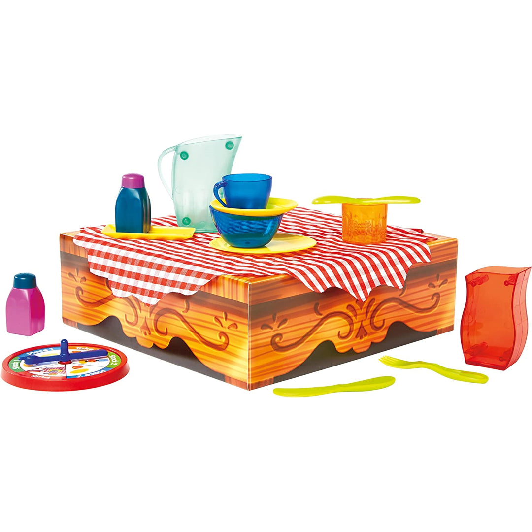 This brand-new game is going to be a lot of fun! The goal is to remove the tablecloth from underneath the plates without causing any of them to fall to the floor. Each player will take a turn spinning the spinner, and then arrange the dishes on the table in accordance with the results. When you land on "pull," you have to remove the tablecloth off the table while trying to keep the plates from scattering everywhere. In order to emerge victorious, you will need to successfully pull the tablecloth three times. You don't need to be concerned since the dinnerware is composed of durable plastic, which ensures that it won't crack even if it slides off the table. Additionally serving in this capacity is the bottom of the box. Everyone in the household will enjoy themselves playing this game.