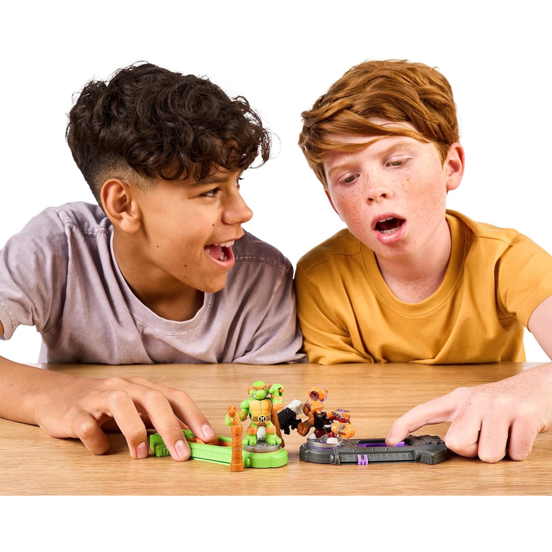 Level up playtime with this epic Teenage Mutant Ninja Turtles battle pack! Watch Leonardo face off against the mighty Rocksteady in an action-packed showdown that's perfect for after-school fun. Each character comes armed and ready - Leo with his signature twin Katanas and Rocksteady wielding his shield and club.
