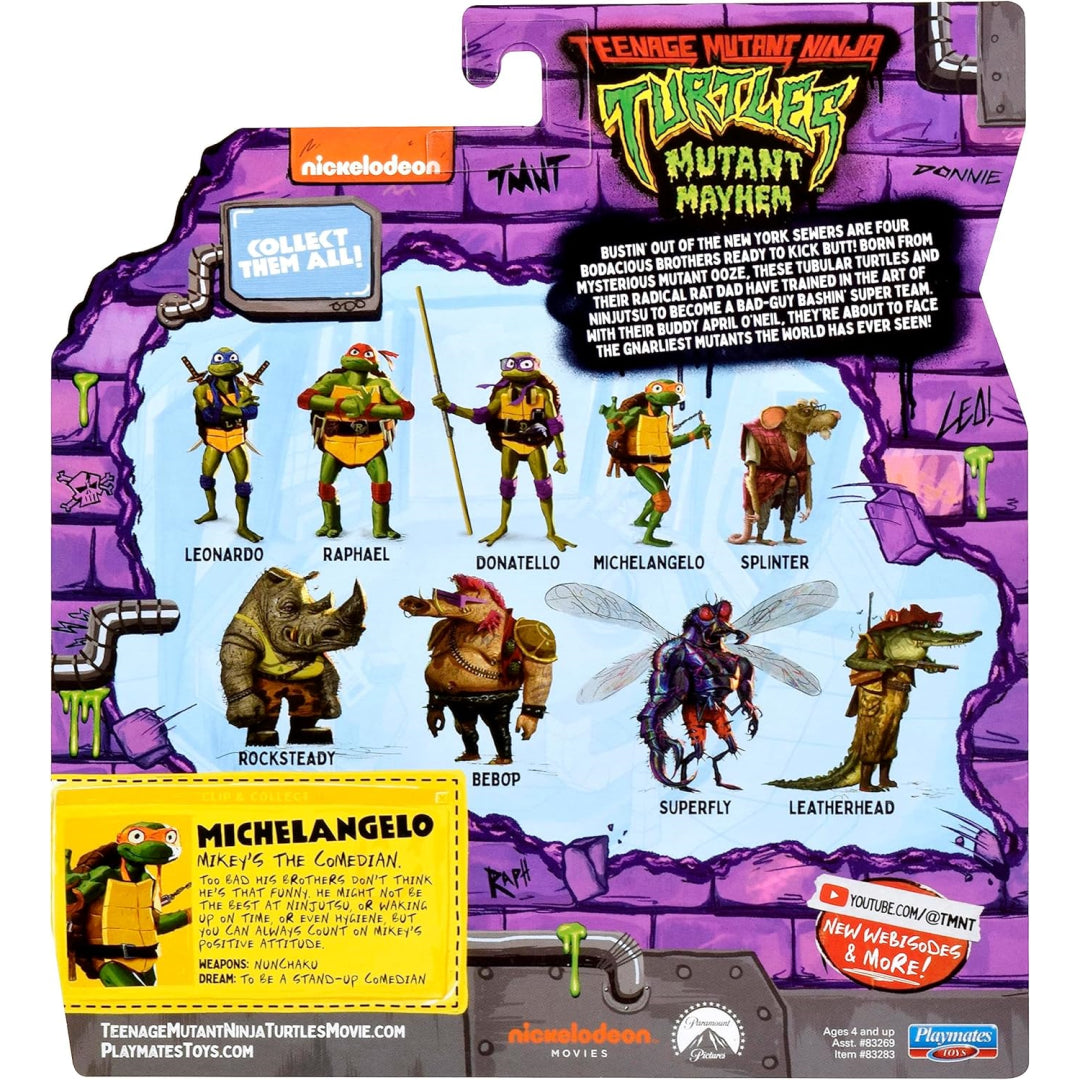 Tap tap "Is this thing turned on?" Mikey believes he's the funniest member of the gang. (His brothers can be a rough bunch.) Michelangelo and his siblings are now prepared to go to the big metropolis so Mikey can try out his stuff after receiving some instruction from his rat-dad Splinter. Even if the only positive feedback he receives is from the microphone, he won't let anything stand in the way of achieving his goal of being a stand-up comedian! The Michelangelo figurine is 4.25 inches tall and made to look like his on-screen persona. Set comes in a special Mutant Mayhem packaging and contains his legendary nunchaku!
