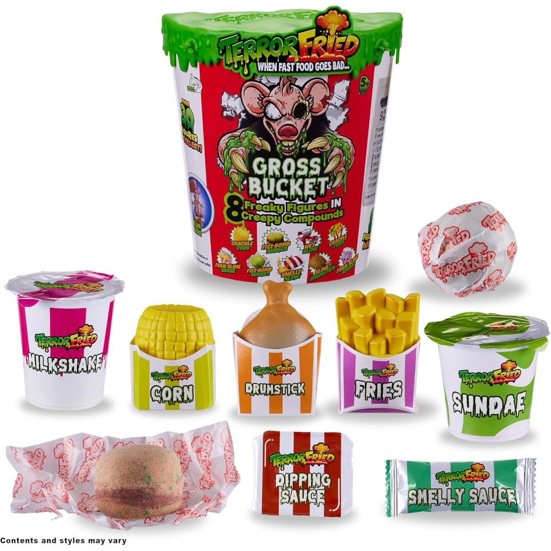 Dive into a world of deliciously disgusting fun with Terror Fried Gross Bucket! Perfect for those after-school moments when your little ones need some entertaining surprises that won't break the bank. Each bucket contains 8 wonderfully weird figures and 9 spooky composite objects waiting to be discovered. Let your kids unleash their imagination as they drop the 'fizz-fry' burger and nugget into water, smash up fries, and squash the vile flurry to reveal slimy sauces, including the revolting Smelly Slime sauce sachet.