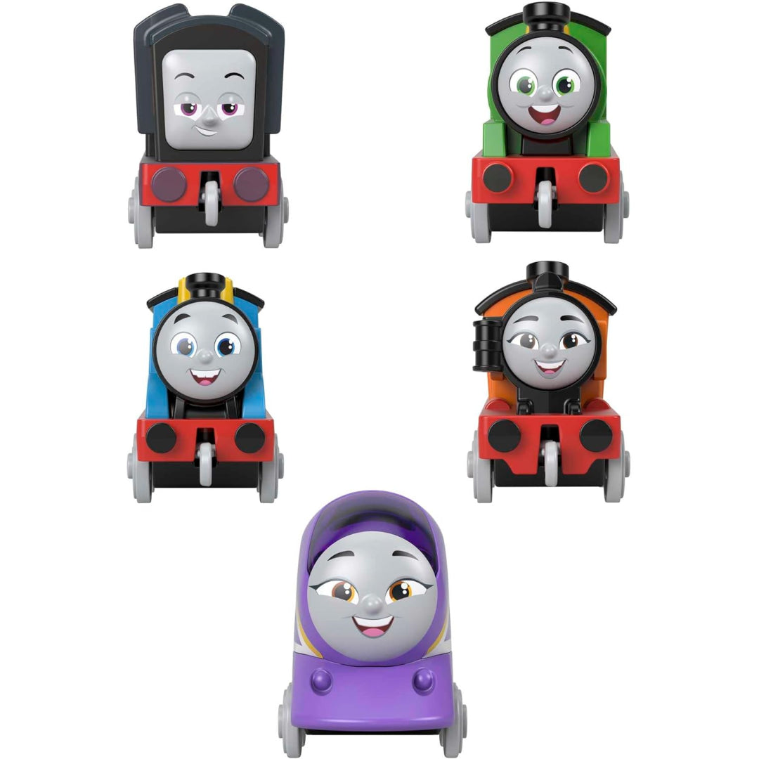 Five die-cast metal push-along engines in the shapes of Thomas, Percy, Diesel, Nia, and Kana from Thomas & Friends.