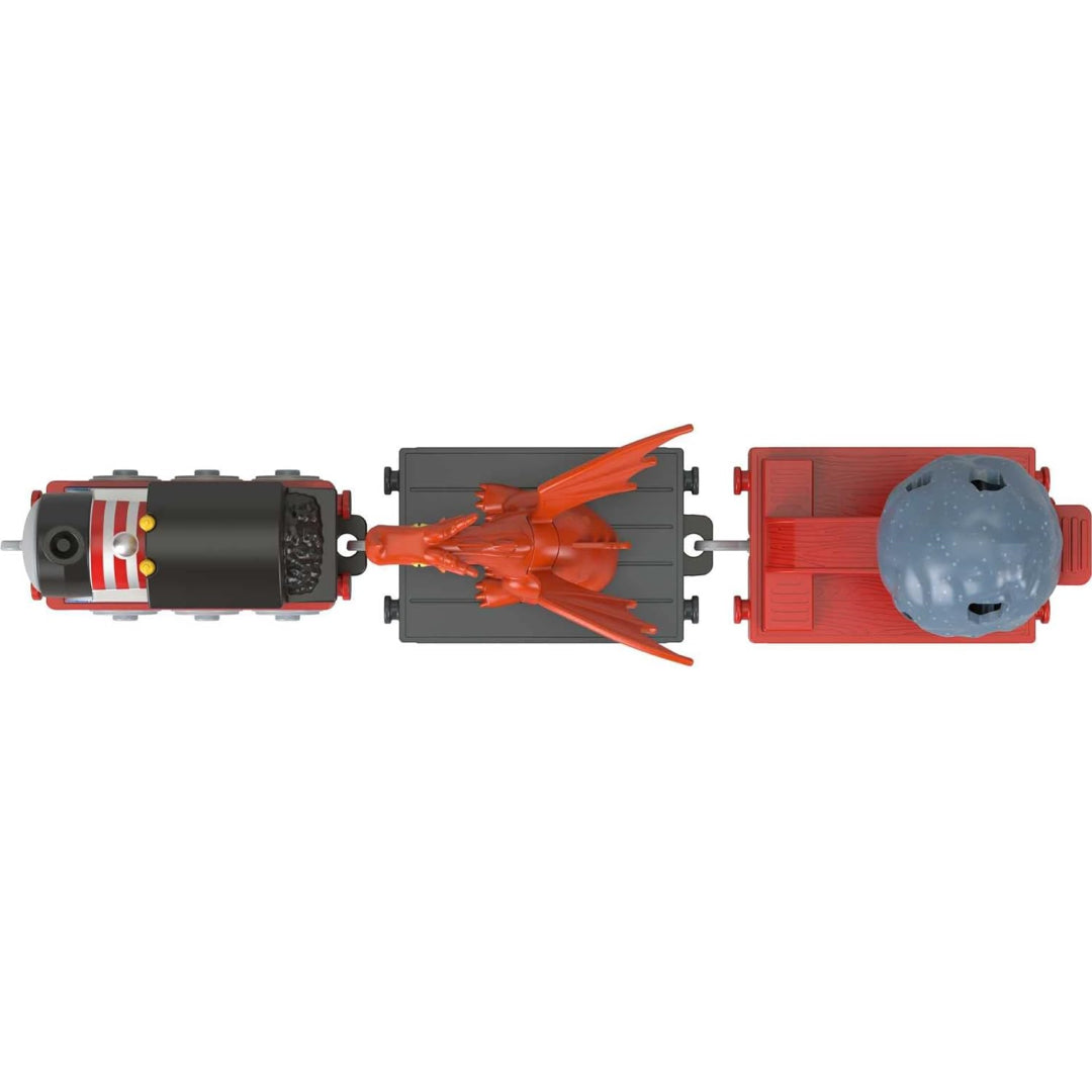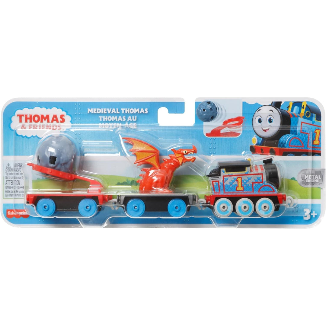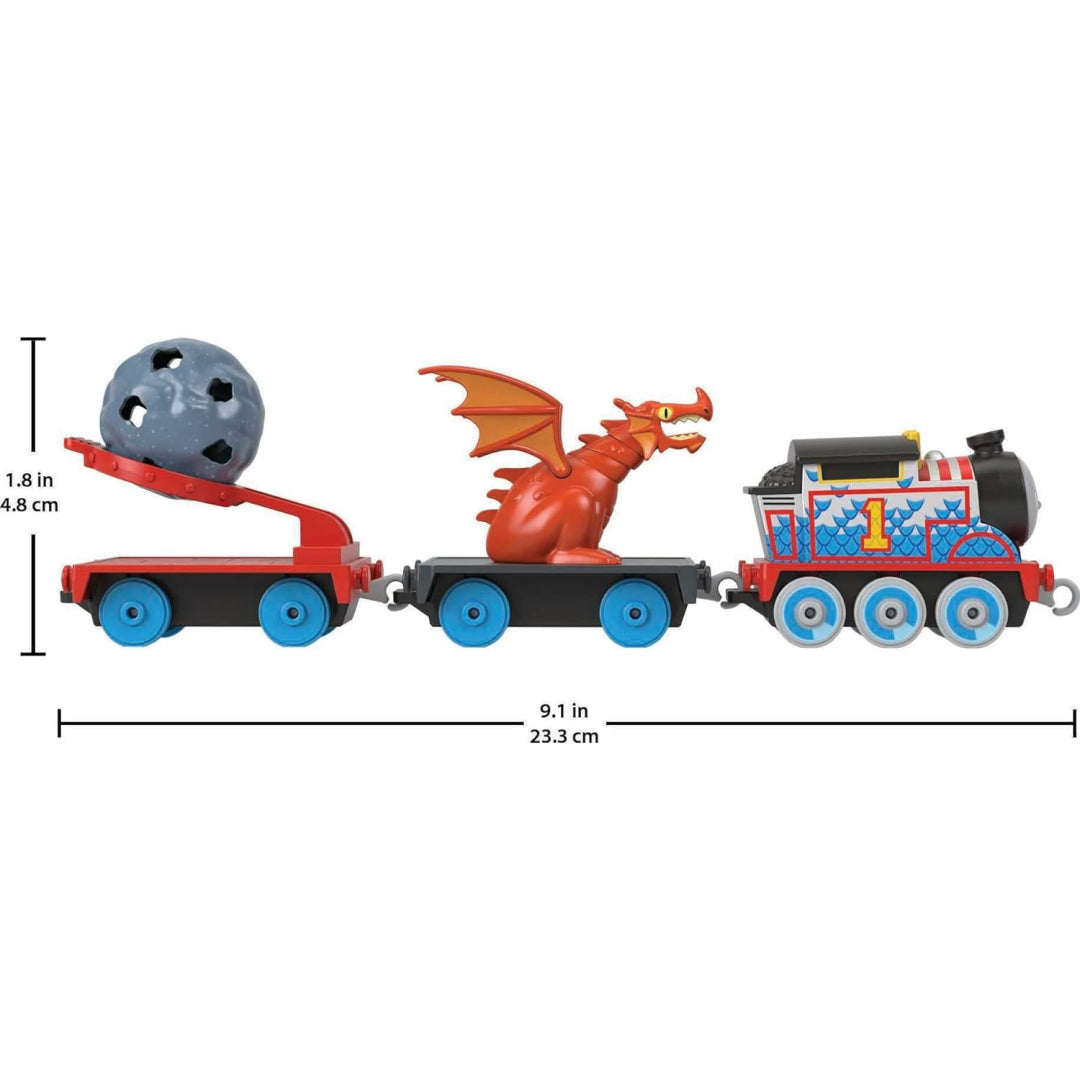 A push-along Thomas engine made of die-cast metal with a mediaeval motif that has a boulder launcher and a detachable toy dragon. To hurl the rock cargo into the air, children may pull back the boulder launcher. All Thomas & Friends track may be used with this toy train (Track sets are supplied separately and subject to availability.) Contains plastic connectors for connecting to other Thomas & Friends trains, automobiles, trucks, or tenders.